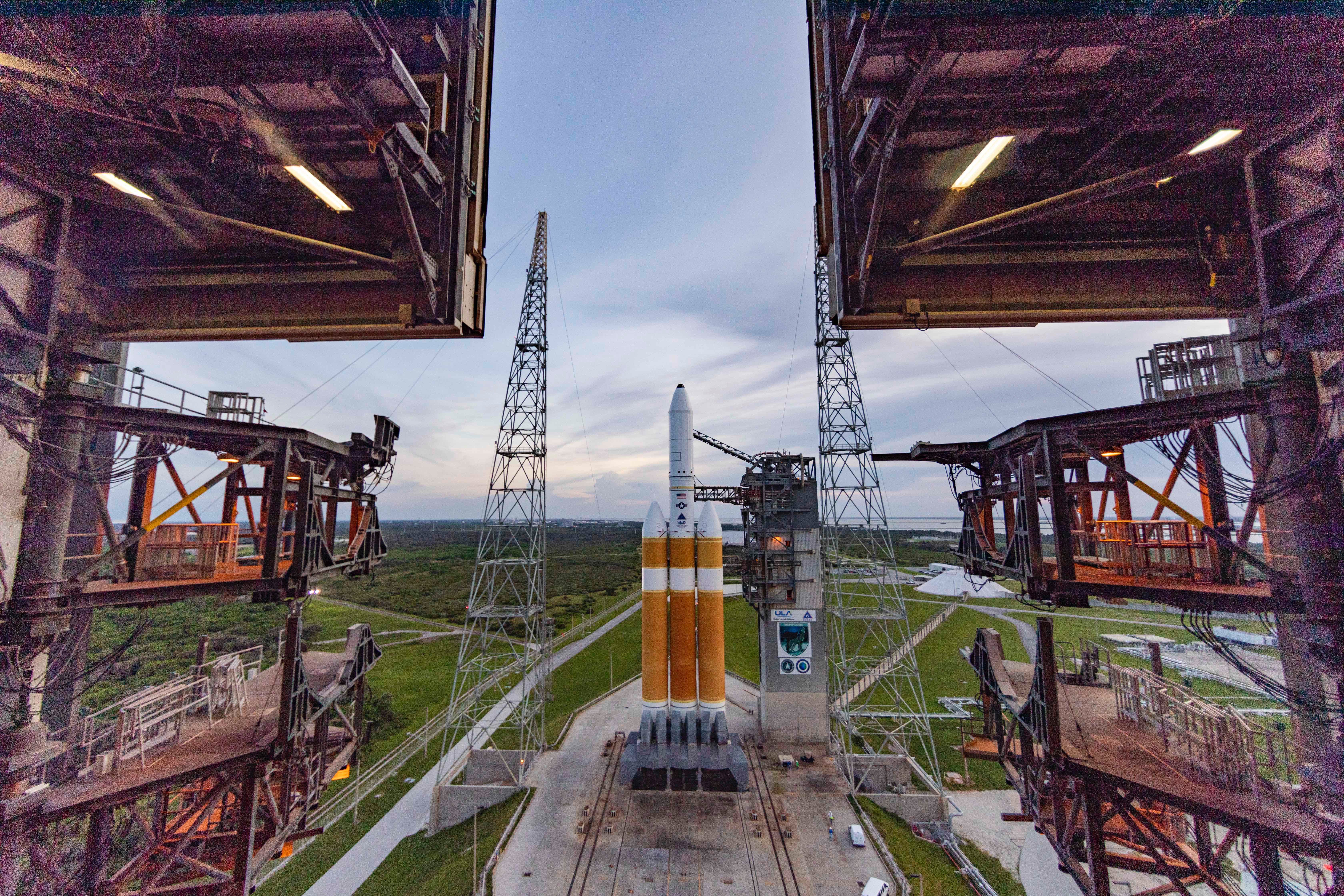 The Mobile Service Tower at Space Launch Complex-37 has been retracted and secured in the launch position, revealing the United Launch Alliance Delta IV Heavy rocket for the NROL-44 launch.
