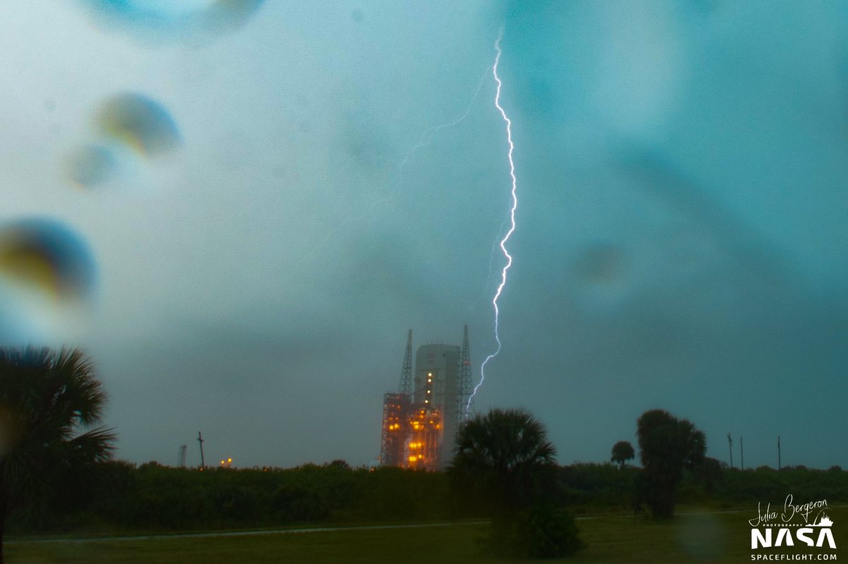 Tower strike!    Our remote camera captured SLC-37's lightning suppression system in action, diverting damage away from #DeltaIVHeavy @NatReconOfc. This may have been the strike @torybruno mentioned.... Others nearby also #NROL44 #Lightning