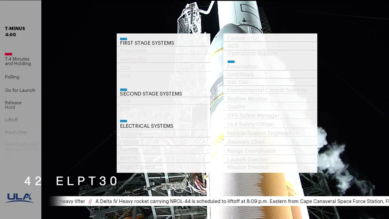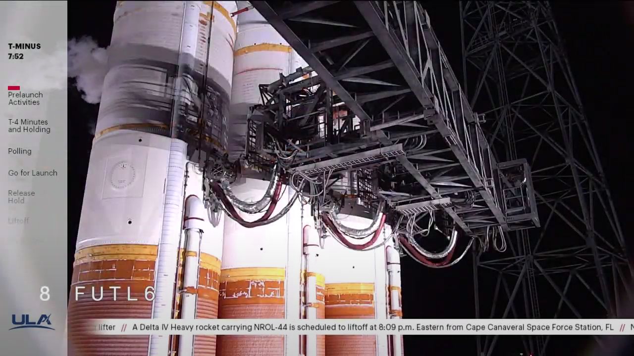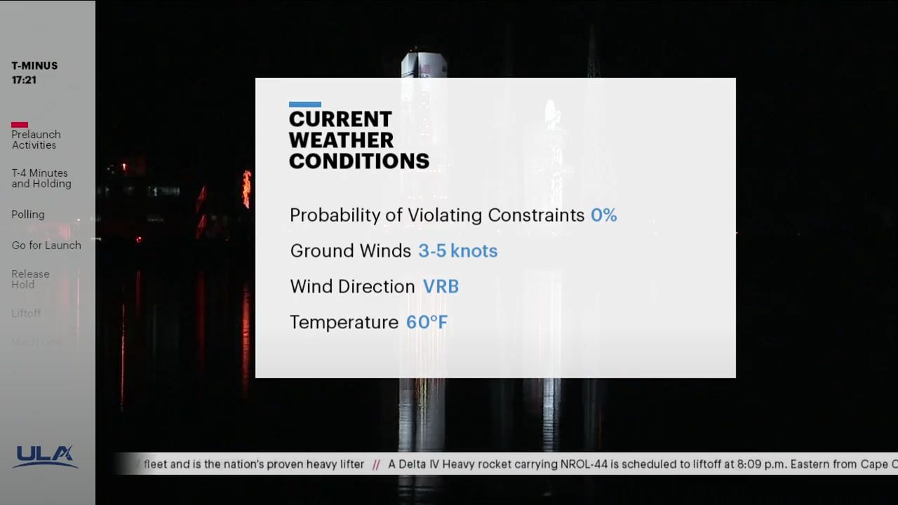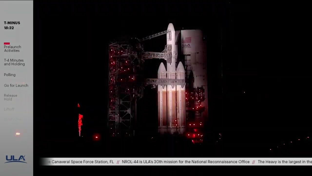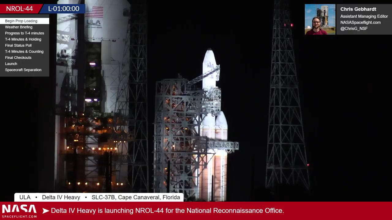 We are 30 minutes away for liftoff time for the Delta IV Heavy rocket and NROL-44 for the National Reconnaissance Office. Standing by for the final weather briefing.