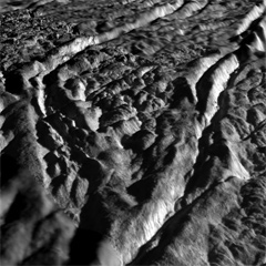 This perspective view of Baghdad Sulcus was generated using high resolution images of Enceladus acquired in August 2008 at 12 to 30 meters (40 to 100 feet) resolution, together with a new topographic map of the region produced by Dr. Paul Schenk (http://www.lpi.usra.edu/lpi/schenk/) at the Lunar and Planetary Institute in Houston, TX.