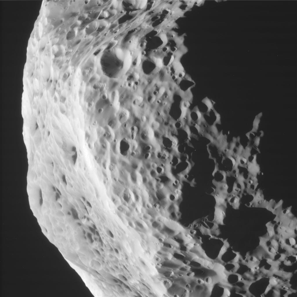 Его поверхность так изрыта множеством кратеров, что внешне он напоминает губку, и, возможно, является ею на самом деле - его плотность составляет лишь половину плотности водяного льда, а значит в нем скрывается множество пустот.