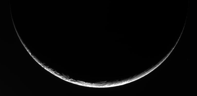 Камеры «Кассини» тоже не теряли времени, фотографируя струи водного льда, водяного пара и органических соединений, вырывающиеся из так называемых тигровых полос — разломов на поверхности Энцелада, расположенных близ южного полюса. Изображения были получены с 106–416 тыс. км, когда Энцелад превратился в узкий полумесяц и струи оказались подсвечены.