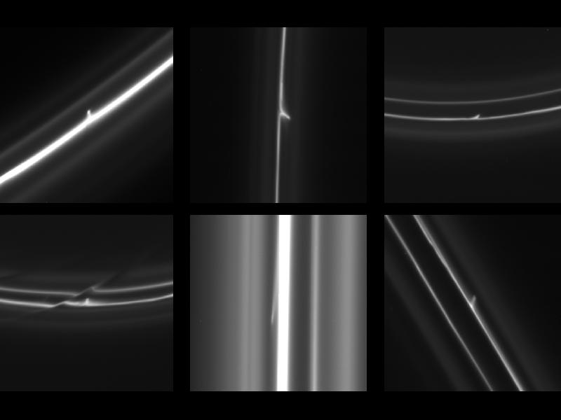 In some cases, the objects traveled in packs, creating mini-jets that looked quite exotic, like the barb of a harpoon. Other new images show grand views of the entire F ring, showing the swirls and eddies that ripple around the ring from all the different kinds of objects moving through and around it.