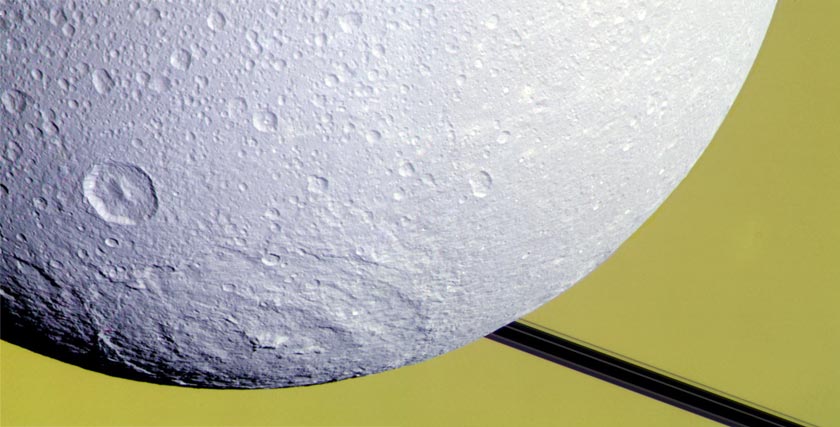 On May 2, 2012, Cassini captured a high-resolution mosaic of Dione poised against the yellow globe of Saturn. The black stripe is Saturn's rings, seen nearly edge-on. The large impact basin at the bottom edge of Dione is named Evander.
