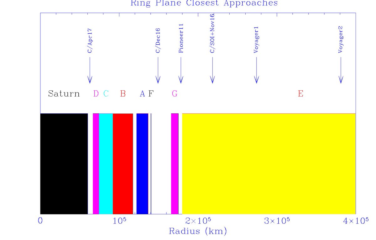 Ring Crossing #1Apr 269:00 a.m.2:00 a.m.First pass through the gap between Saturn's atmosphere and innermost ring. High Gain Antenna will be used as a shield to protect from possible ring particle impacts.