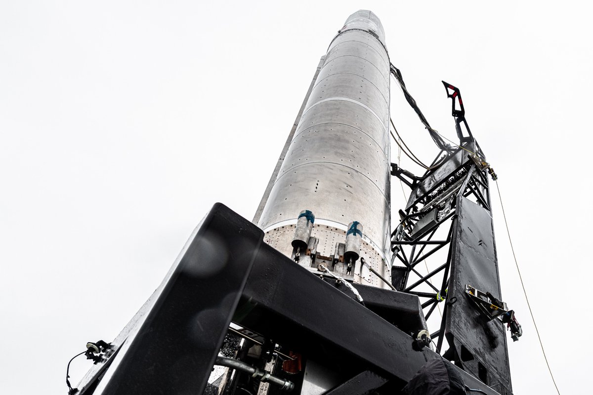 Astra's Rocket 3.0 launch vehicle, nicknamed "One of Three," is raised vertical at the Pacific Spaceport Complex — Alaska ahead of Astra's first orbital mission, which will be the first launch of the DARPA Launch Challenge. (Photo: Astra)