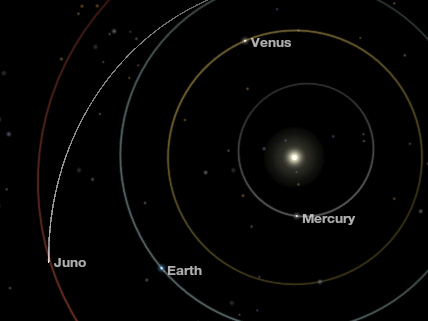 "Джуно", стартовавший 5 августа 2011 года, летит к Юпитеру кружным путем - чтобы отправить тяжелый зонд напрямую к цели понадобилась бы слишком мощная и дорогая ракета. Поэтому зонд сделает круг вокруг Солнца и в октябре 2013 года вернется к Земле, чтобы воспользоваться гравитацией нашей планеты, которая как праща "закинет" его к Юпитеру.