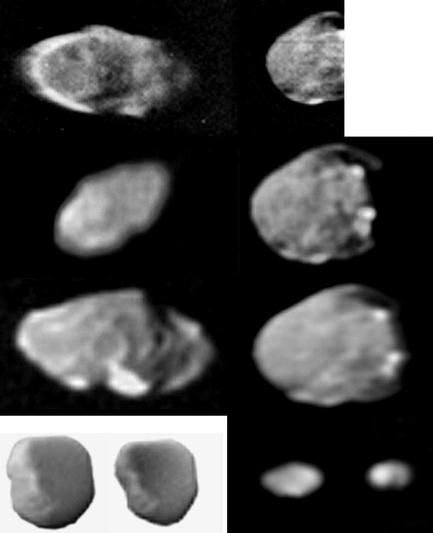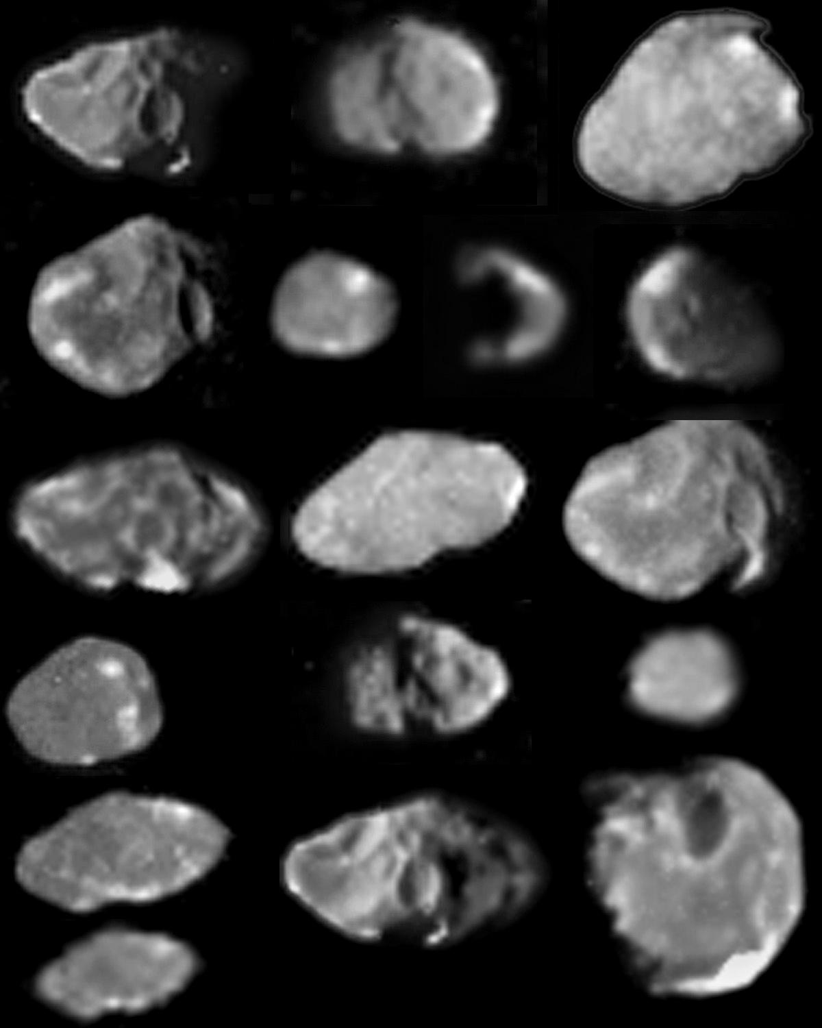 Давайте закончим с Амальтеей.  Прекрасный маленький мир - как бы я хотел, чтобы у нас было его изображение крупным планом!  Но к нему трудно подобраться, он находится глубоко в радиационном аду Юпитера.  Вот полный набор снимков, сделанных миссиями "Вояджер" (без учета отдельных кадров в многоспектральных последовательностях).  Обратите внимание на два снимка, сделанных во время транзита над Юпитером. Многоспектральные последовательности показывают, что он темный и красный с несколькими белыми пятнами.