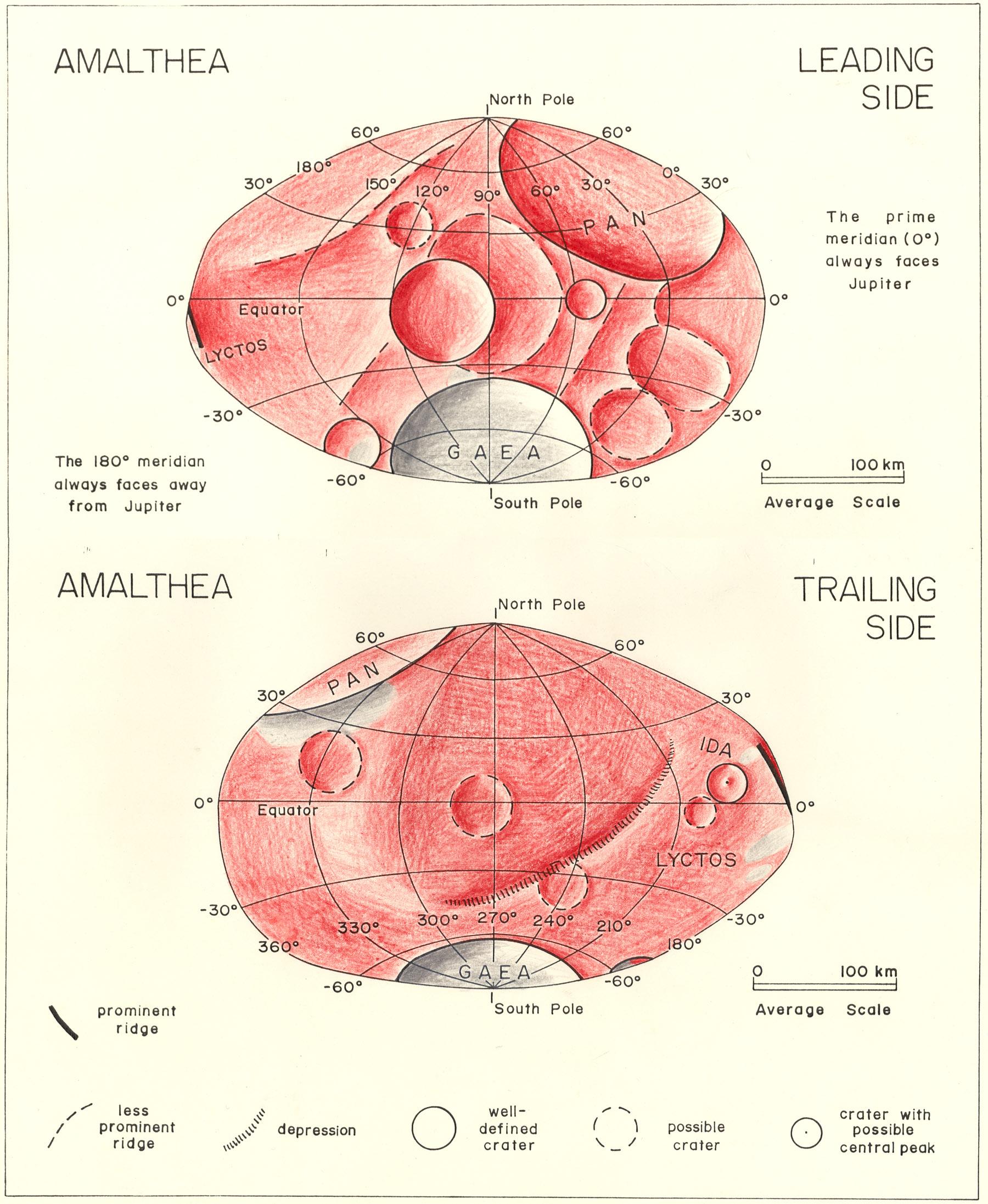 В далеком 1988 году я сделал простую карту Амальтеи, еще до того, как начал заниматься Proffing lark  в Вестерне.  Это было еще в юрском периоде, когда надписи наносились на карту чернильной ручкой, которую держали в рамке и обводили утопленные буквы по своеобразной линейке. Я сделал целую карту Венеры таким же образом.  Сейчас бы у меня не хватило терпения!  Никакой модели фигуры за этим не стояло, просто грубая эллипсоидная аппроксимация формы.