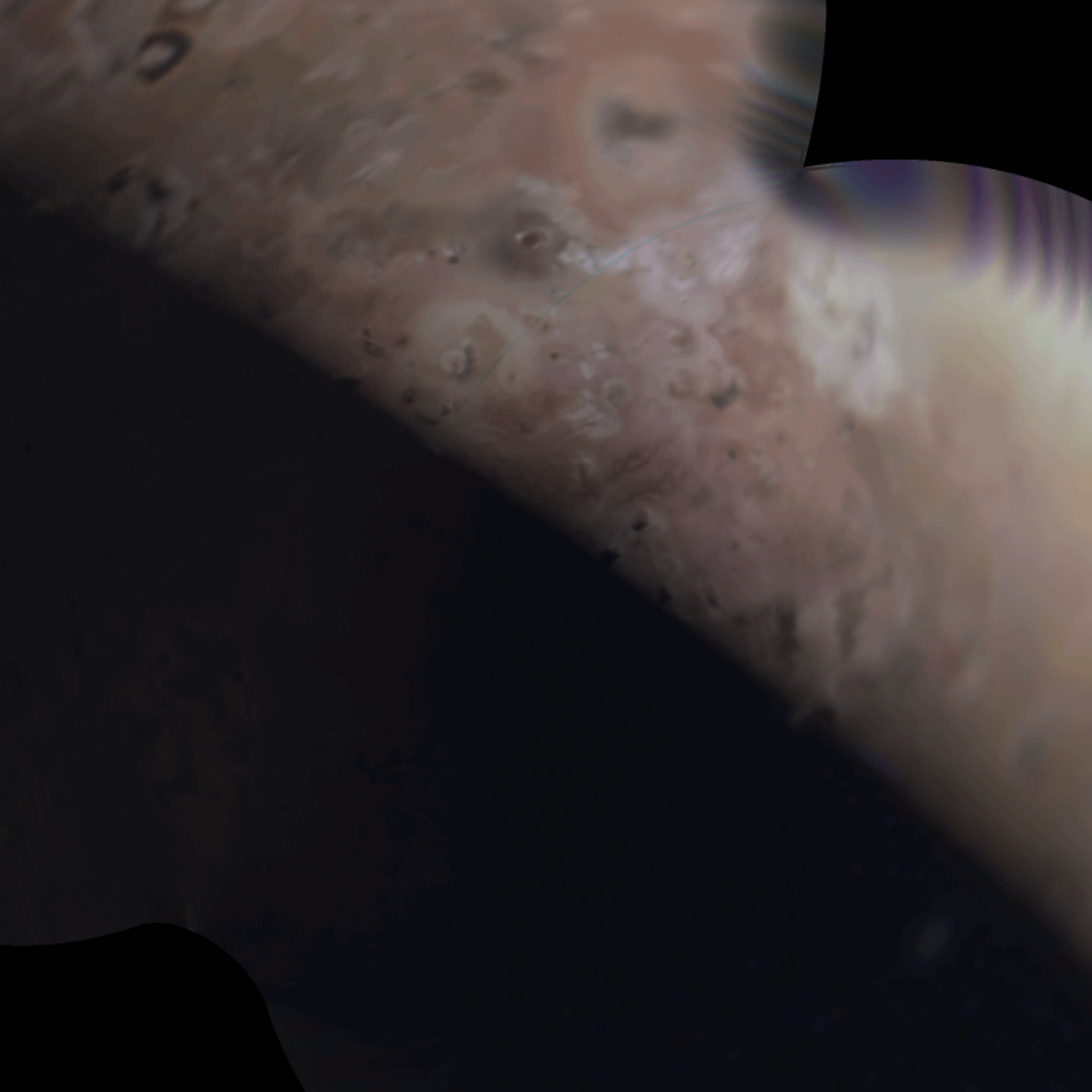 Эти изображения декомпозированы и сбалансированы по белому с линейными коэффициентами (0.629;1.0;3.65) для (R;G;B) на основе входящих изображений PJ63 JunoCam, затем произведено аффинное растяжение для удаления большей части фона и получения более яркого результата.