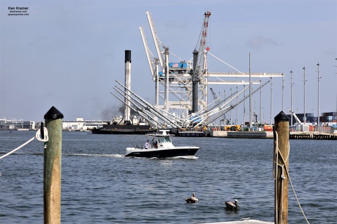 Sister #SpaceX fairing catch ships #GOMSTREE & #GOMSCHIEF arrived @PortCanaveral overnight-recovered nosecone halves already craned off. Did see pair of likely practice fairings. ...