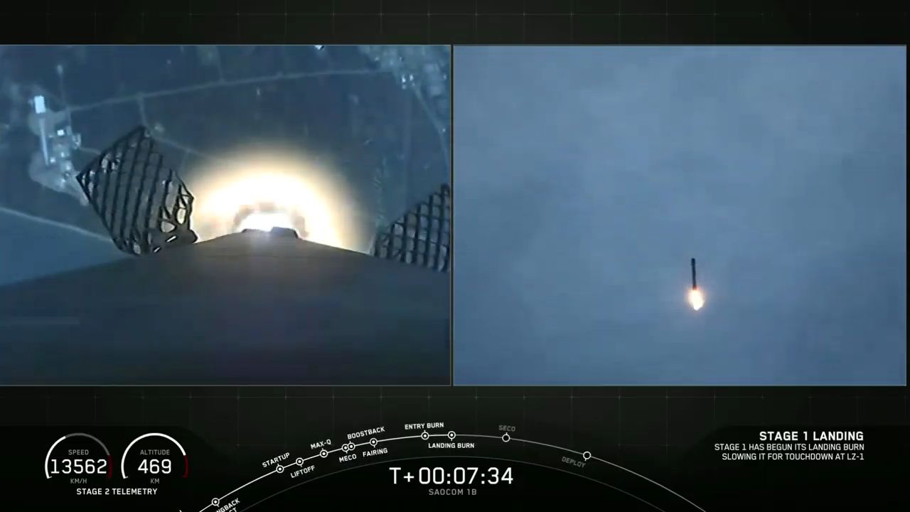 What goes up must come down. The weather held off long enough for Falcon 9 to deliver #SAOCOM1B on the first polar orbit launch for SpaceX. The cloud cover did deliver an amazing sonic boom as the booster landed at LZ-1.