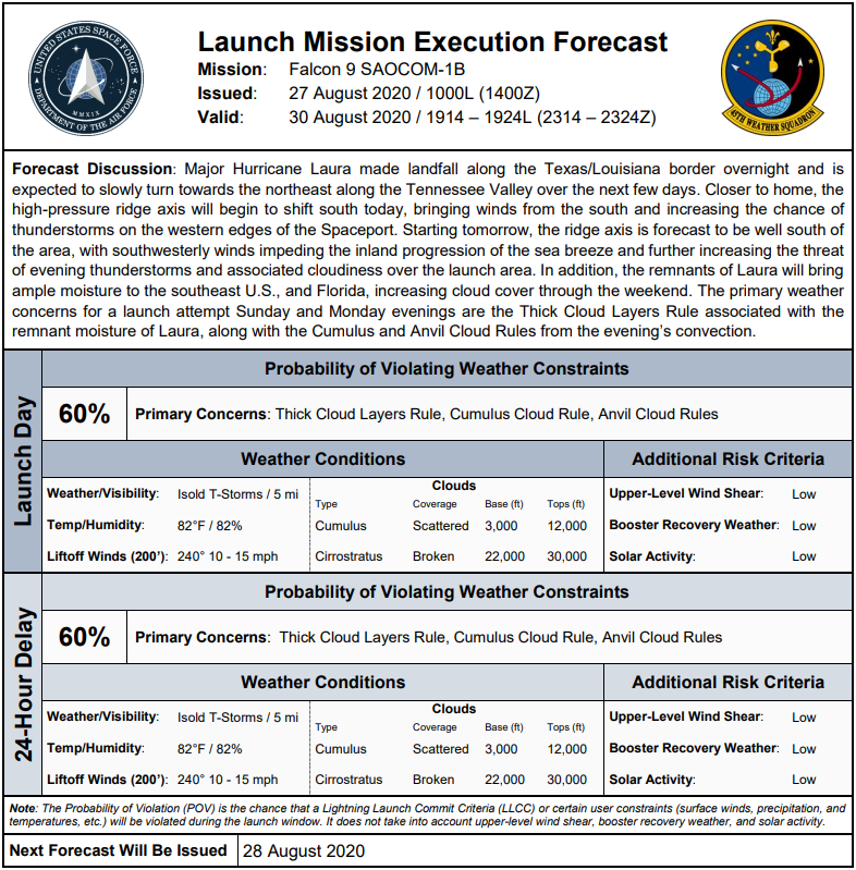 Weather is 50% favorable for liftoff of Starlink and 40% for SAOCOM 1B