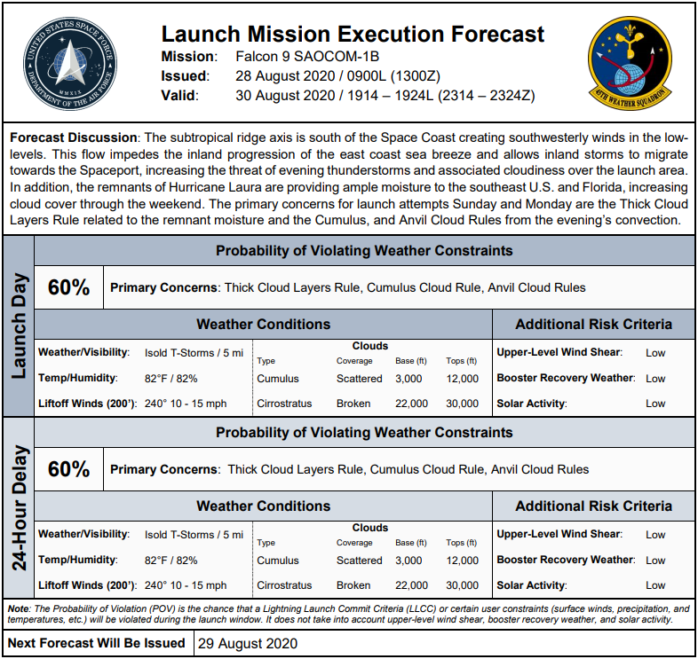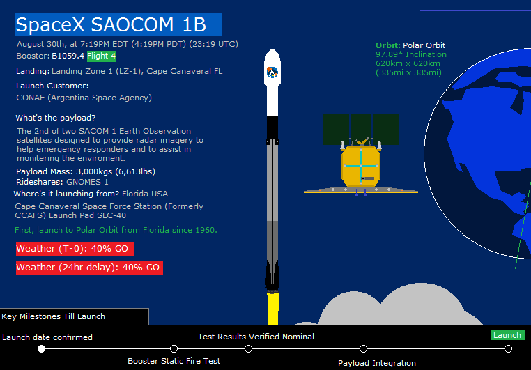 Due to conflicts on the range, #SpaceX teams are targeting a new T-0 of August 30th, at 7:19PM EDT (4:19PM PDT (23:19 UTC) for the launch of the #SAOCOM1B Mission for @CONAE_Oficial. Weather for the new launch opportunity stands at 40% favorable. #GNOMES1 #Falcon9