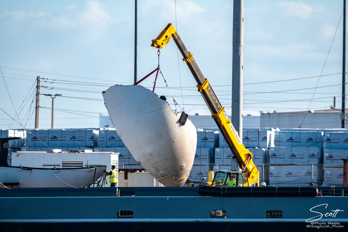 #SpaceX's Go MsChief, shown here, came in with a fairing that was in at least 2 pieces. It was returned to the warehouse for further damage assessment. It will be interesting to see how much damage has been done to the halves & if there are any usable parts left. #NASA #Space 2/2