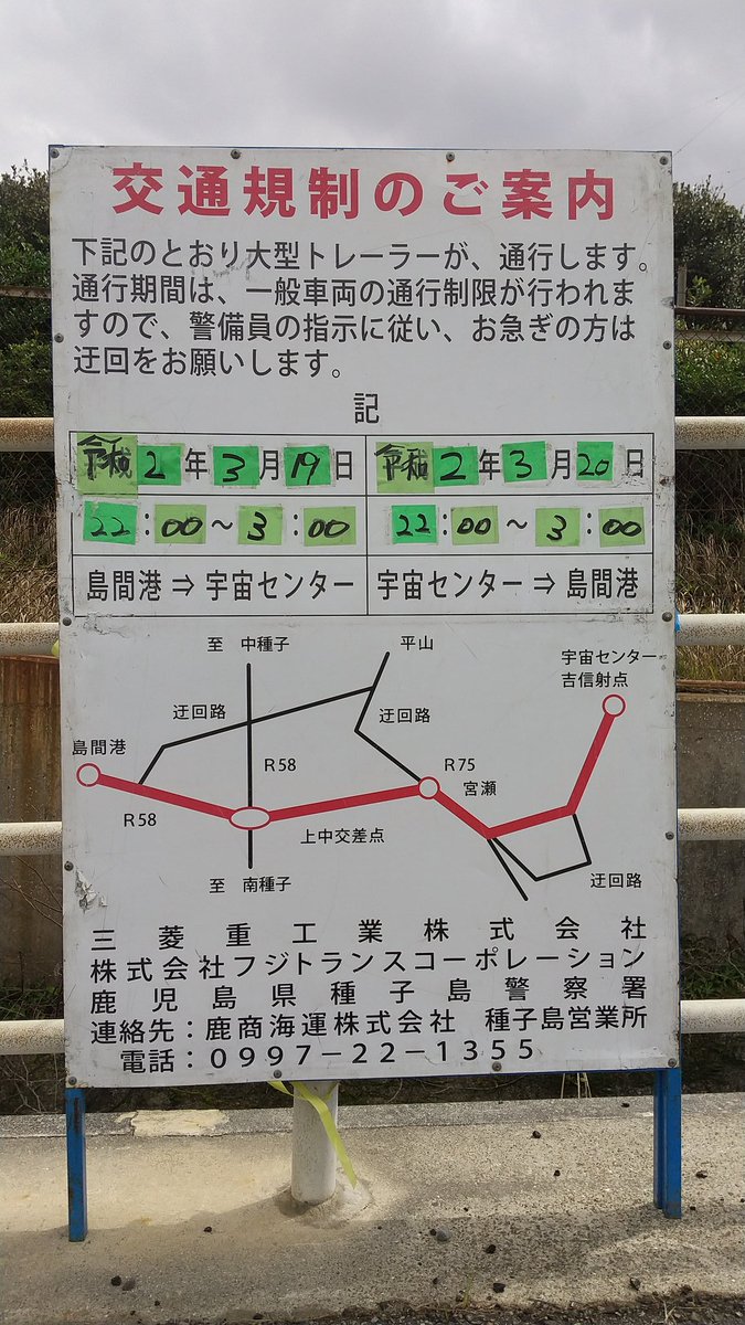 Объявление о предстоящих ограничениях дорожного движения 19 и 20 марта в связи с предстоящими работами по выгрузке в порту о. Танегасима и ночной перевозке на космодром контейнеров со ступенями РН H-2B9.