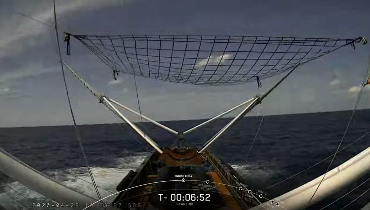 Примерно через 45 минут после старта ракеты два специальных морских судна - Ms. Tree и Ms. Chief в Атлантике должны были "поймать" в надводные сети обе створки обтекателя головной части ракеты, которые спускались на парашютах.