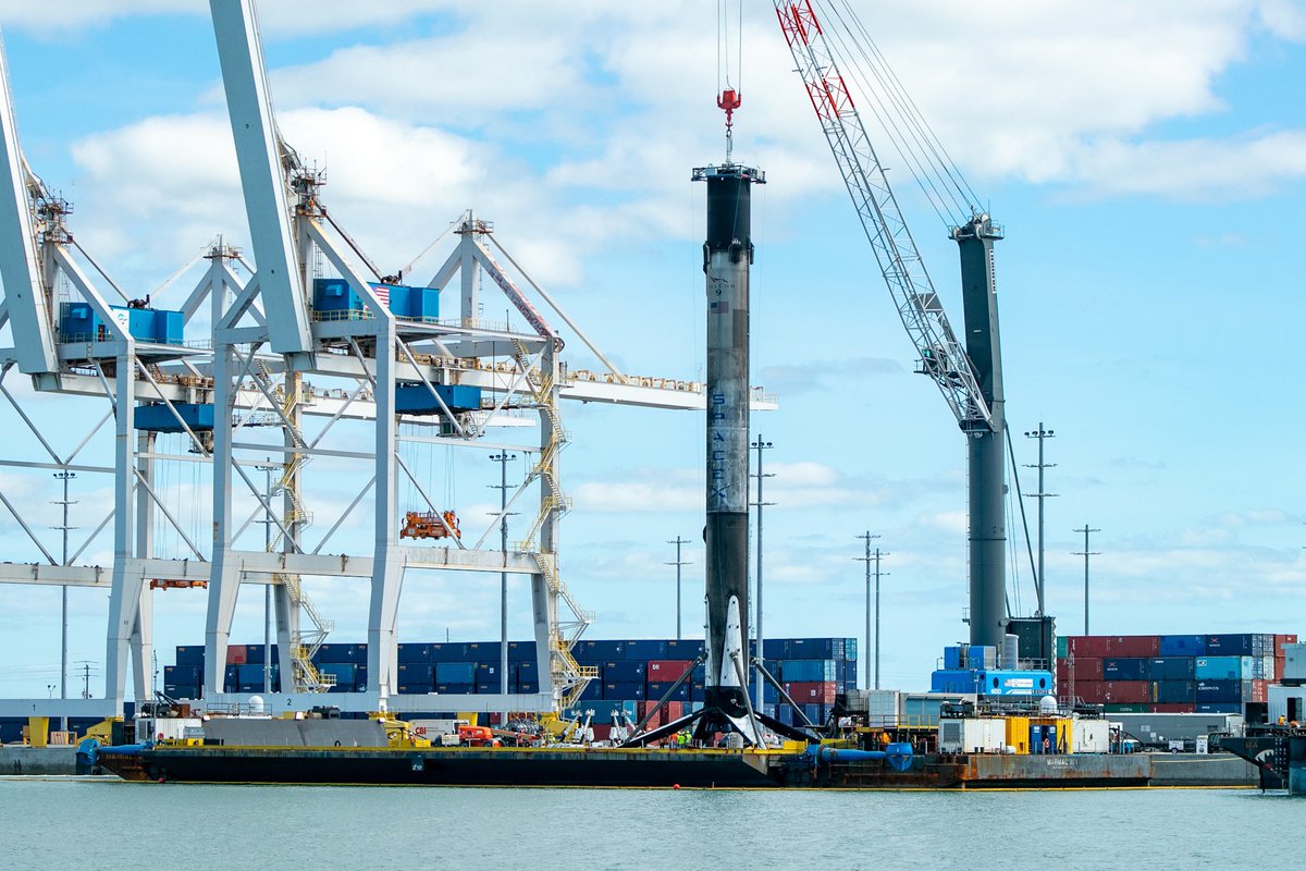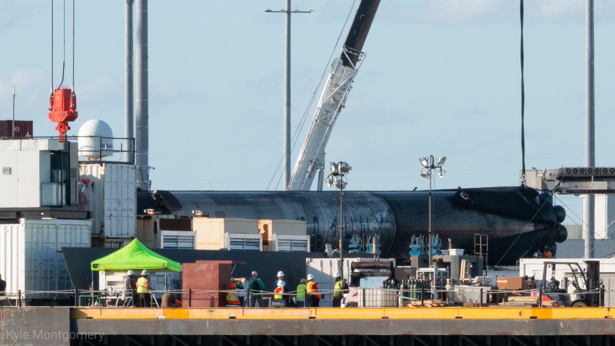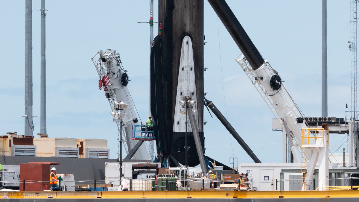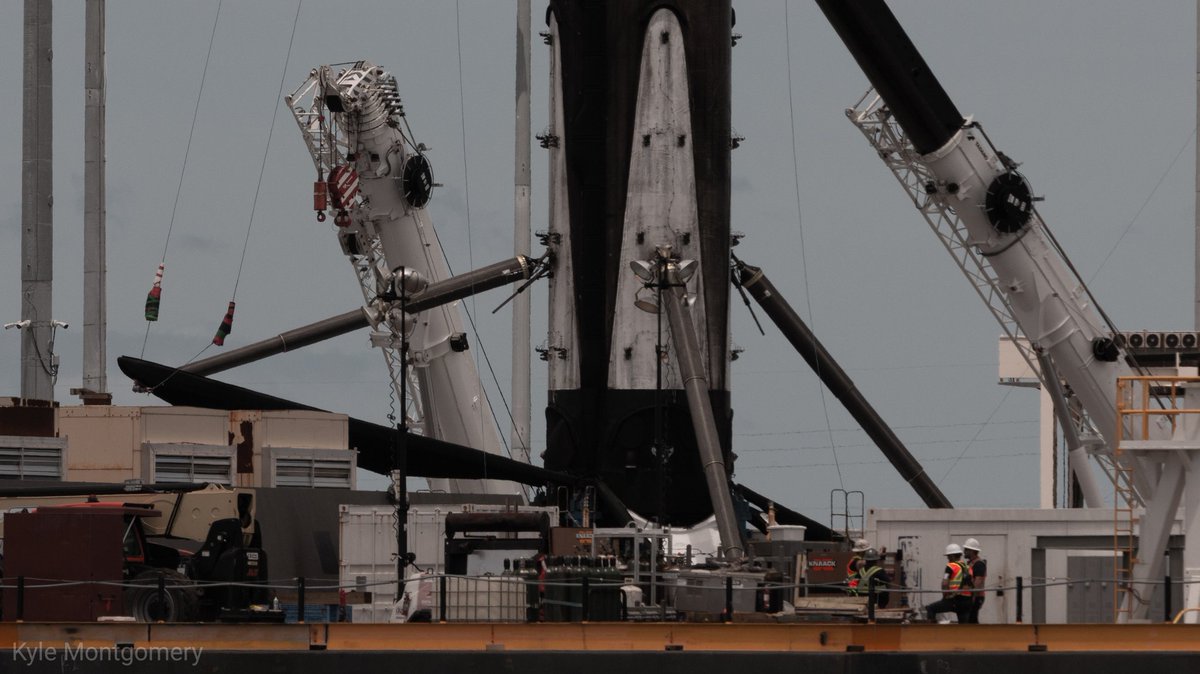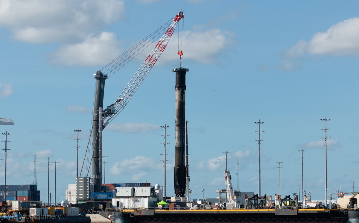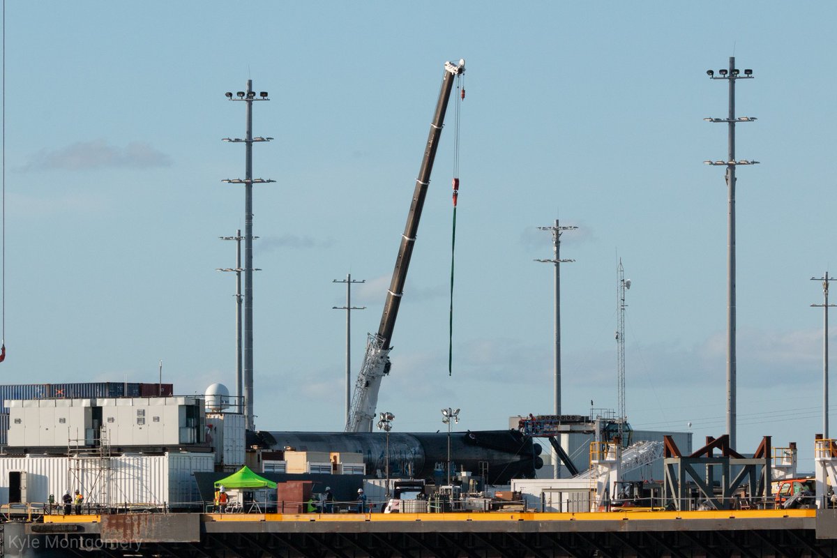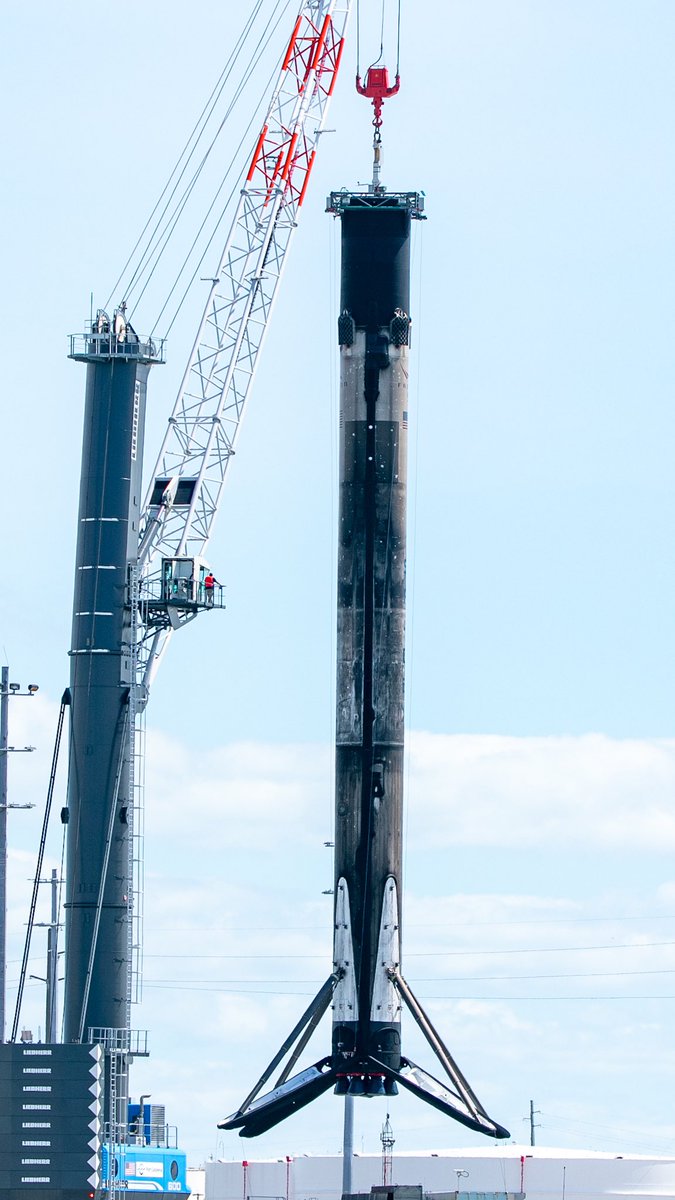 Action at the port with Falcon 9 B1051.4 shows it being lifted off the drone ship and shifted over land. Being lowered toward the stand right this moment. #SpaceXFleet