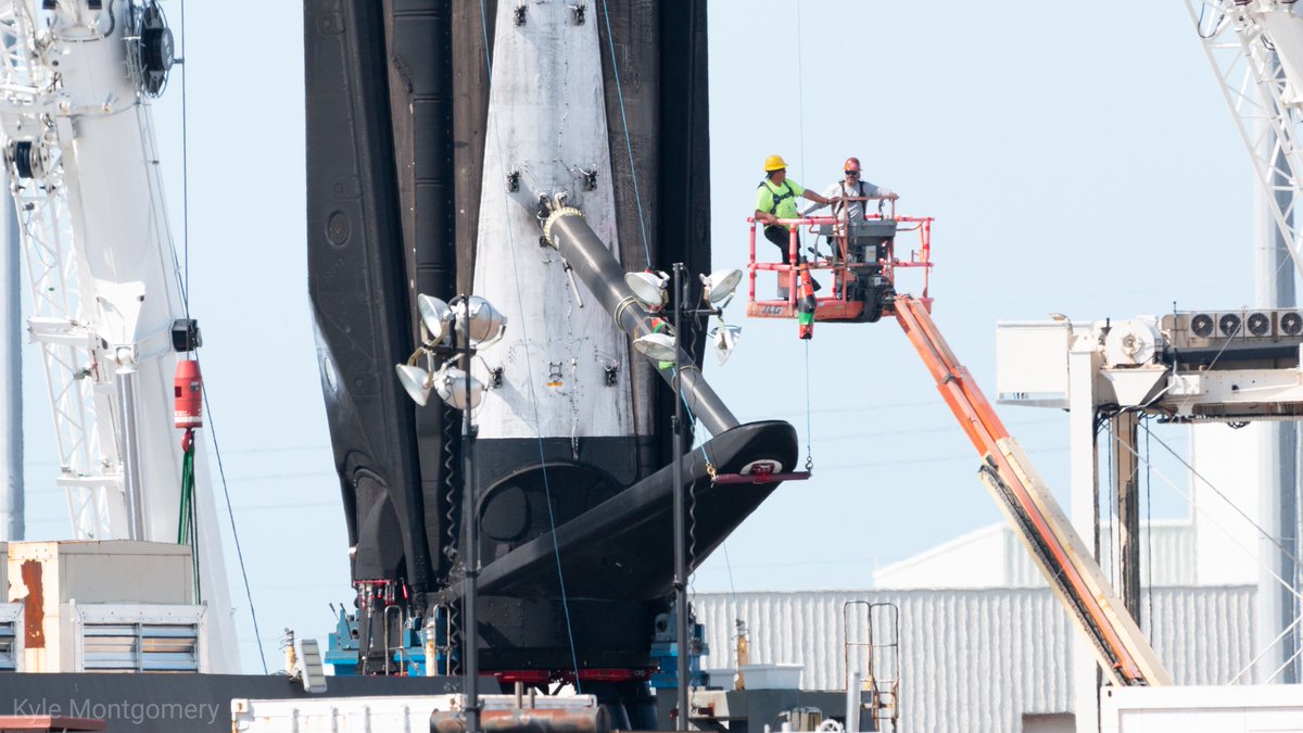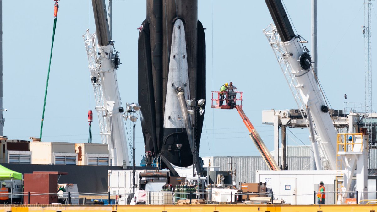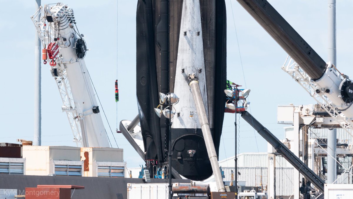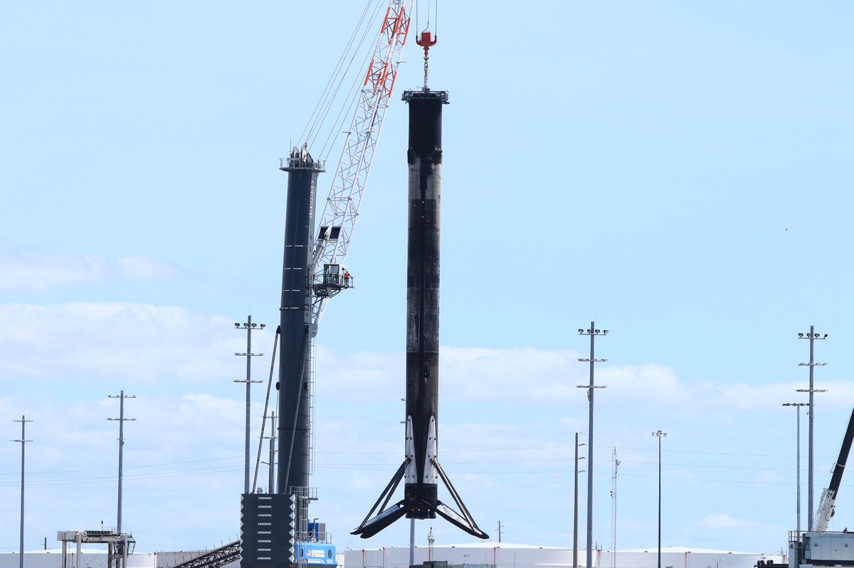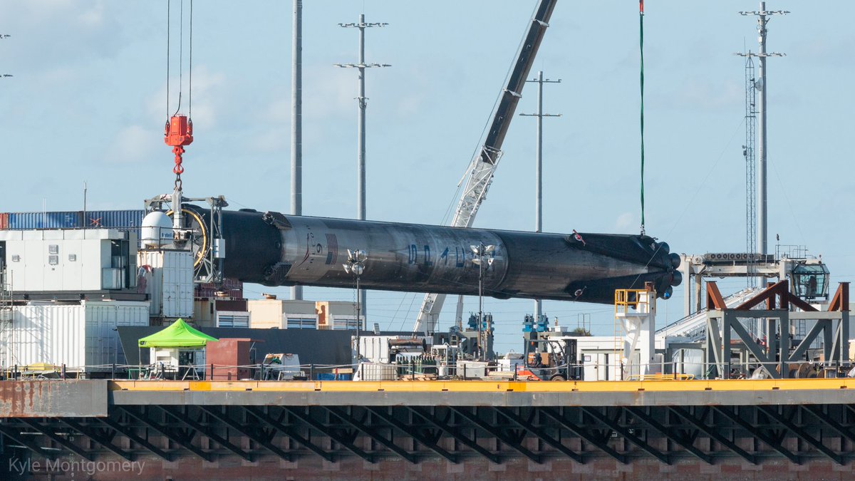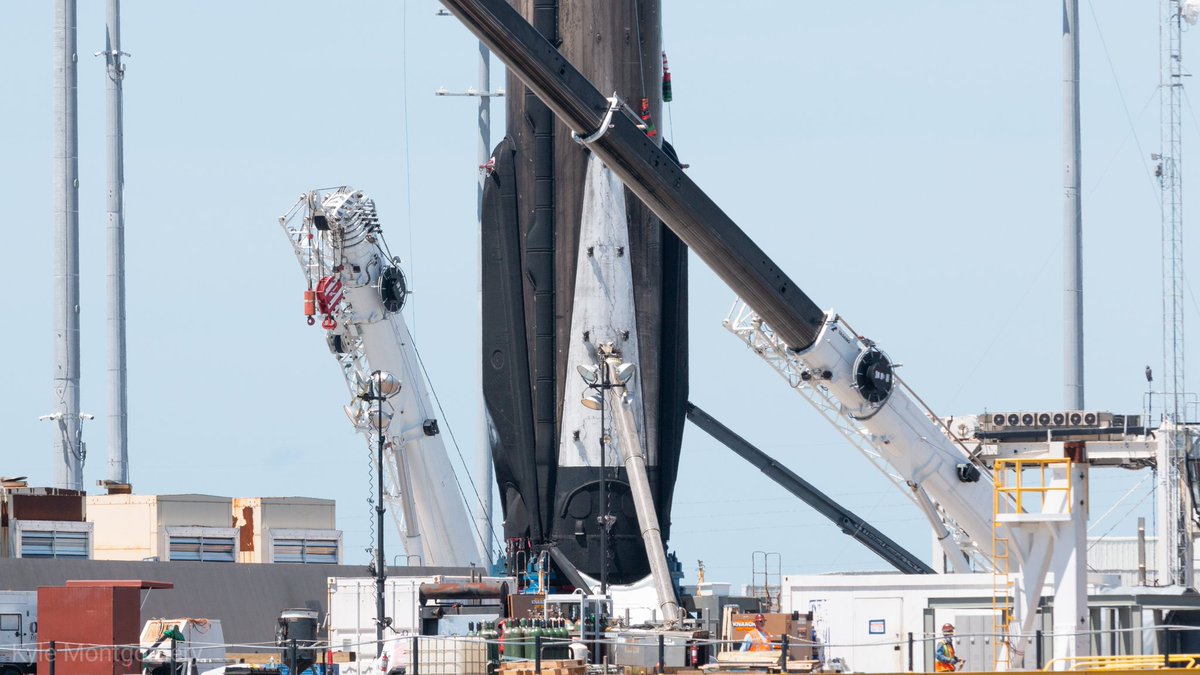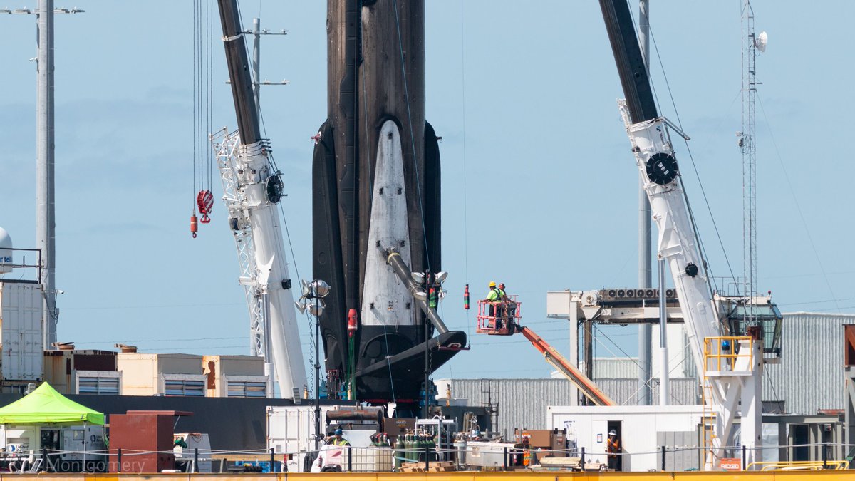 Action at the port with Falcon 9 B1051.4 shows it being lifted off the drone ship and shifted over land. Being lowered toward the stand right this moment. #SpaceXFleet