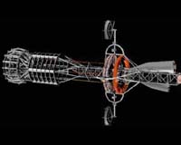 A Penn State artist's concept of an antimatter-powered Mars ship with equipment and crew landers at the right, and the engine, with magnetic nozzles, at left.