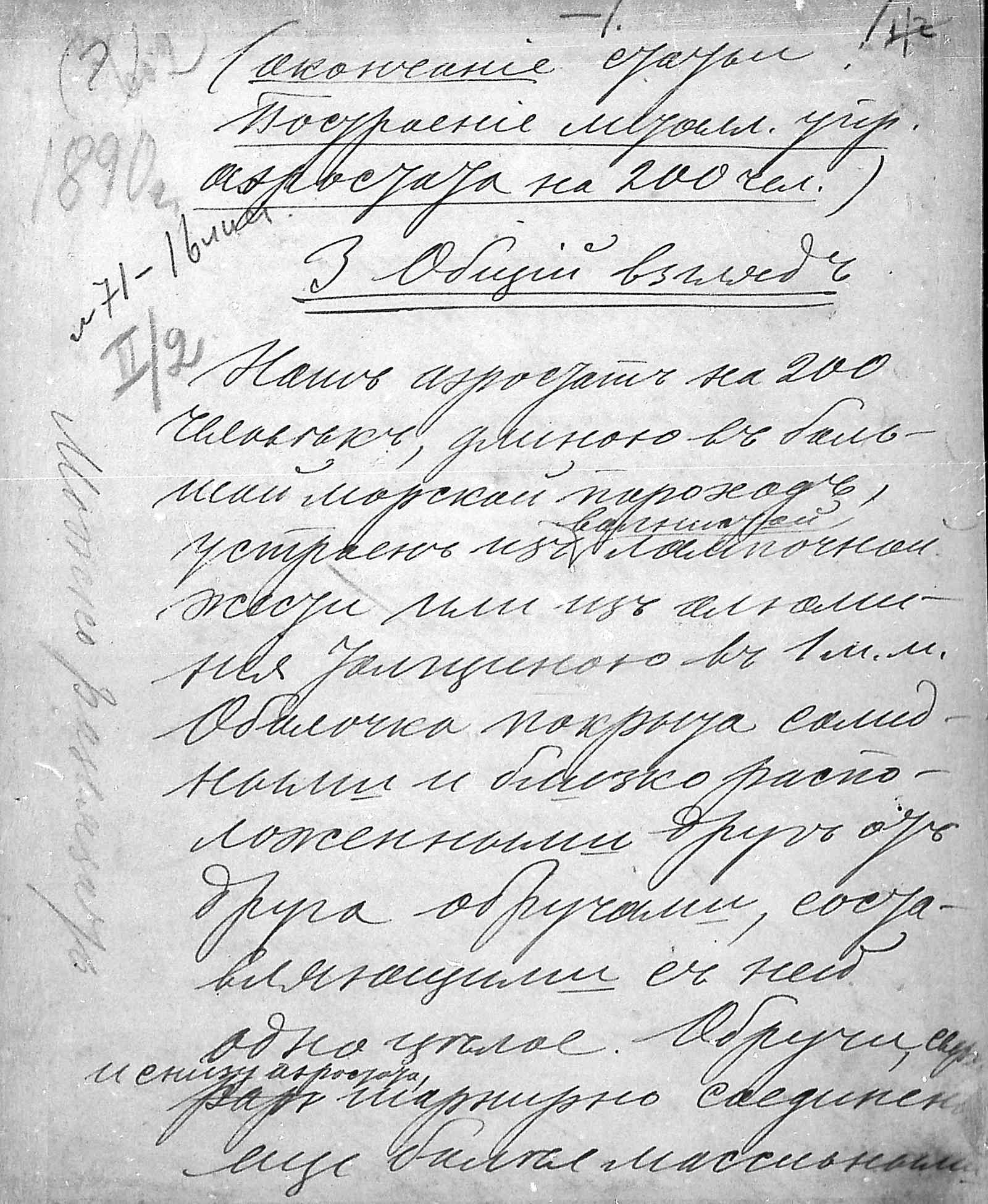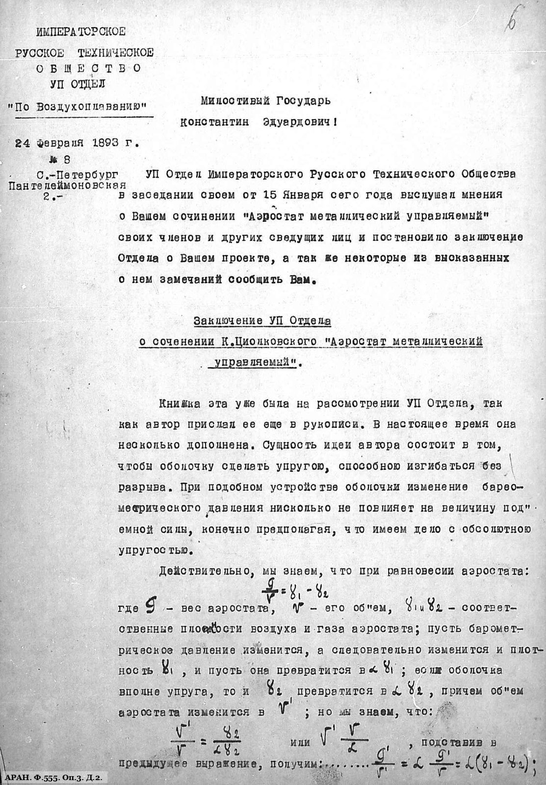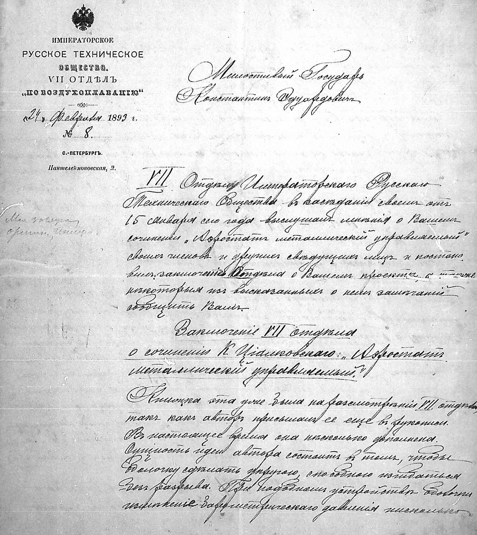 «Устроенная модель показала, что размеры аэроната, вполне упругого, начинаются с высоты в два метра (сажень). Теория же показывает, что эти размеры могут достигать и высоты башни Эйфеля (300 м). Благодаря возможности малых размеров можно начать постройку с маленького аэроната. Тогда мы рискуем немногим, а между тем научимся строить аэронаты более серьезных размеров. Поэтому второй шаг мы уже сделаем почти с уверенностью в успехе. Возможность грандиозных размеров оболочки допускается крепостью и дешевизной железа и стали».