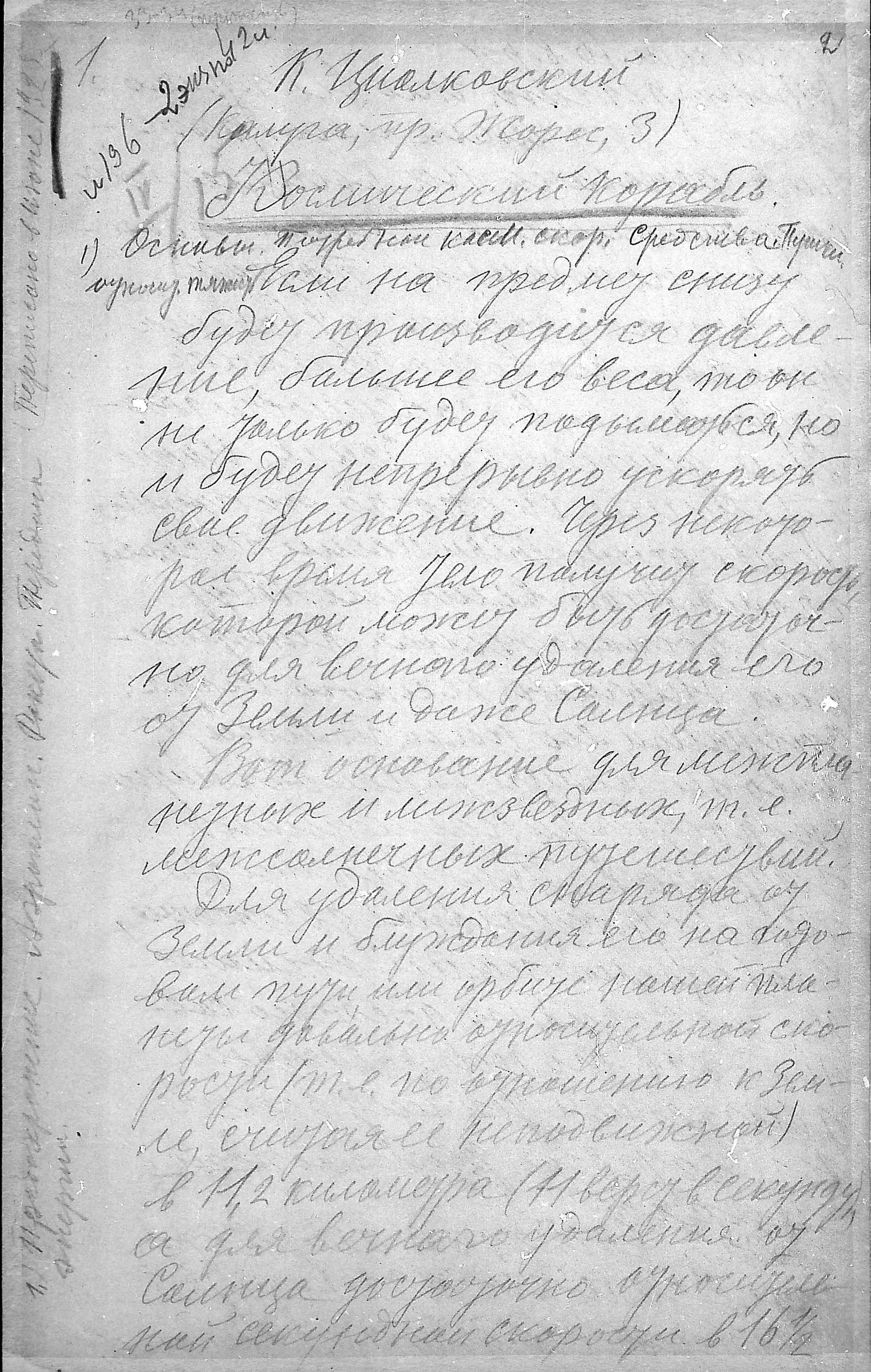 «По описанию полета видно, что ракета может сделаться вечным спутником Земли, движущимся вокруг нее, подобно Луне... Движение вокруг Земли ряда снарядов, со всеми приспособлениями для существования разумных существ, может служить базой для дальнейшего распространения человечества».