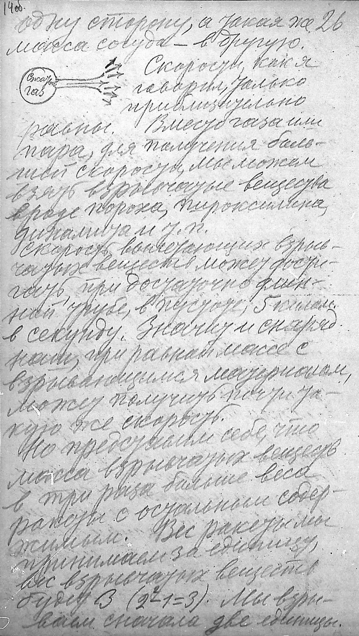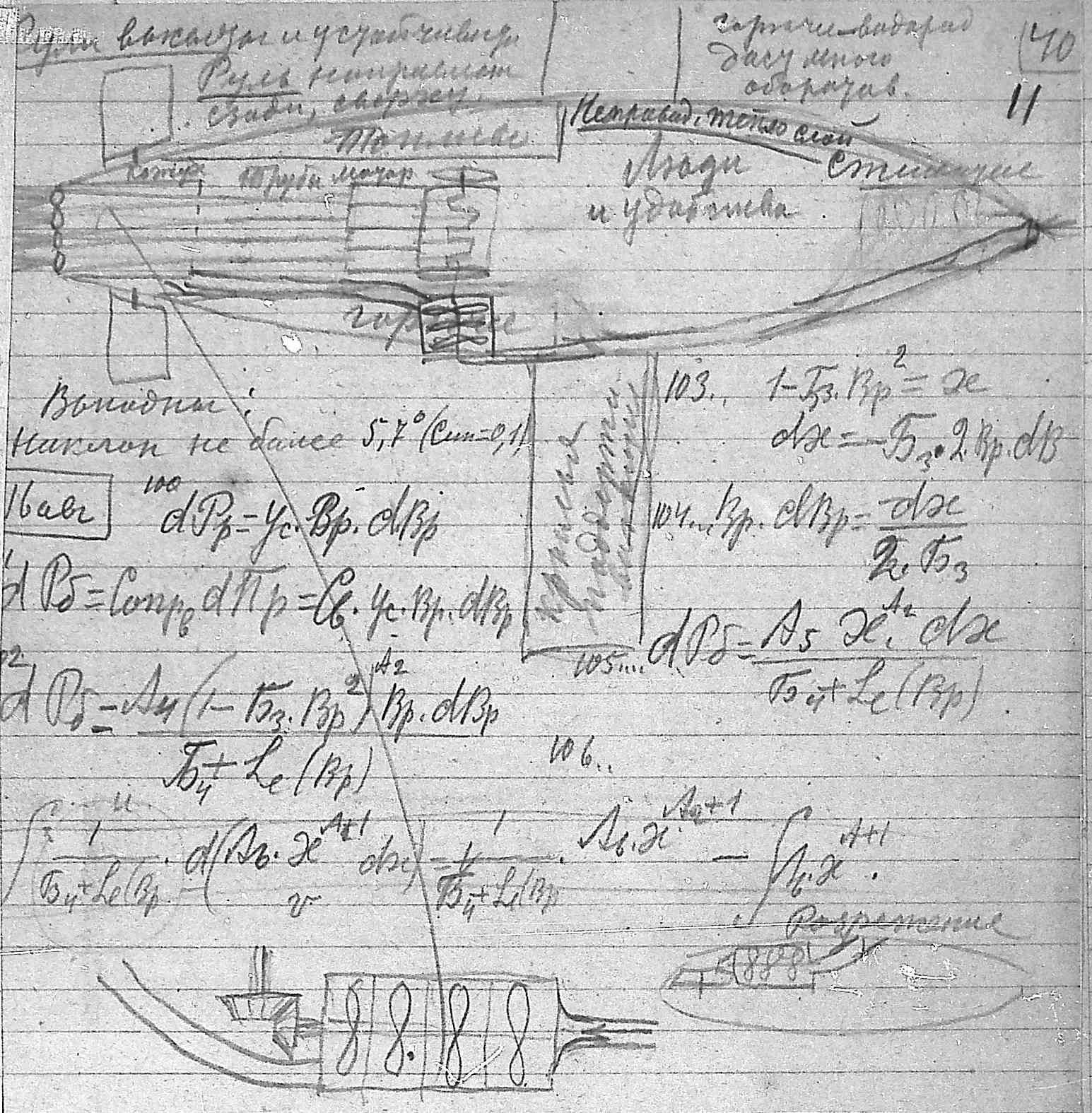 «Углеводороды выгодны, потому что дают очень летучие продукты: водяной пар и углекислый газ; кроме того, жидкий углеводород при обыкновенной температуре не поглощает значительного количества теплоты при своем нагревании, как жидкий и очень холодный чистый водород... Вопрос об управлении ракетой не покажется лёгким. Сгибая выходной конец взрывной трубы и изменяя тем направление вылетающих газов, мы вызываем боковое давление и изменение положения ракеты».