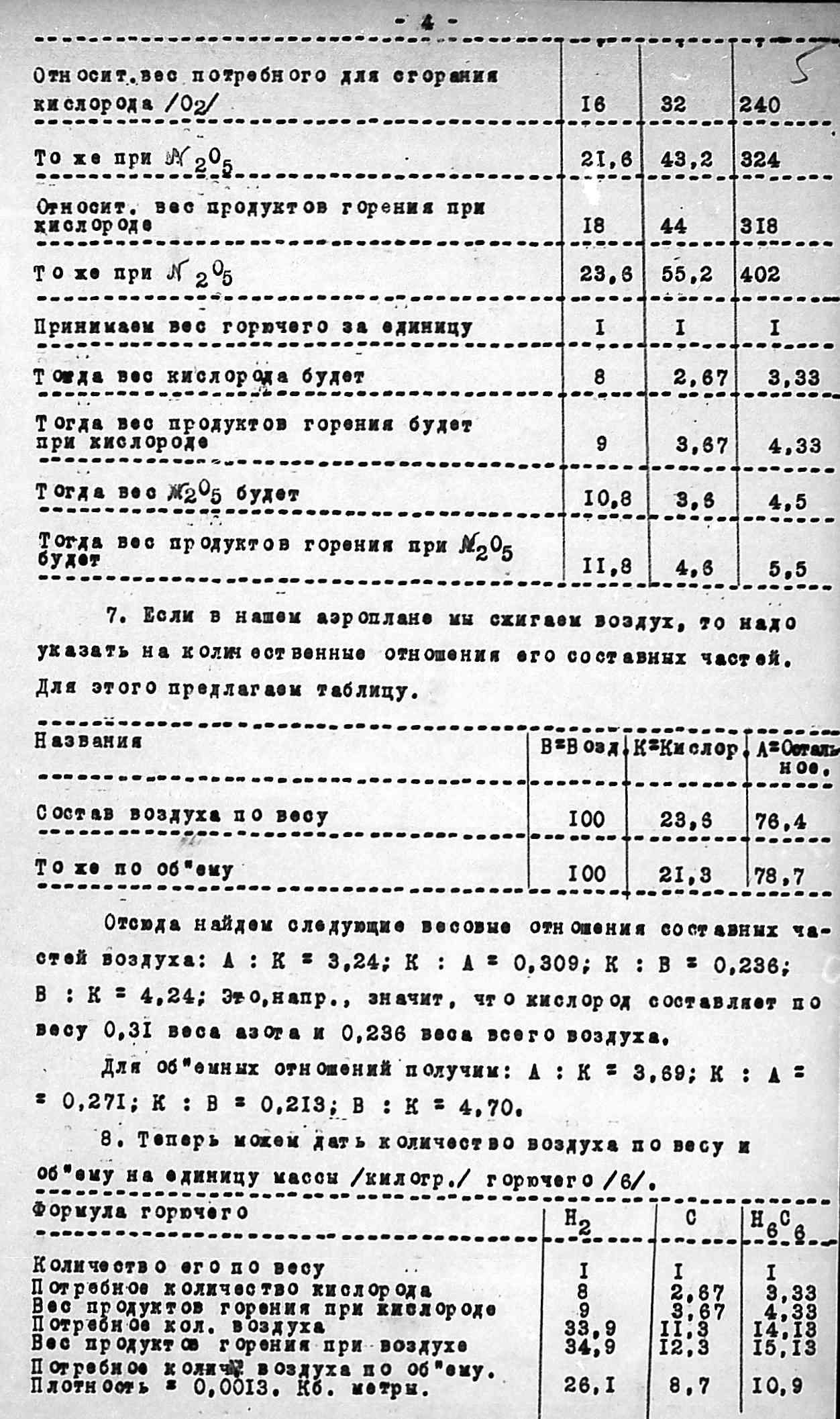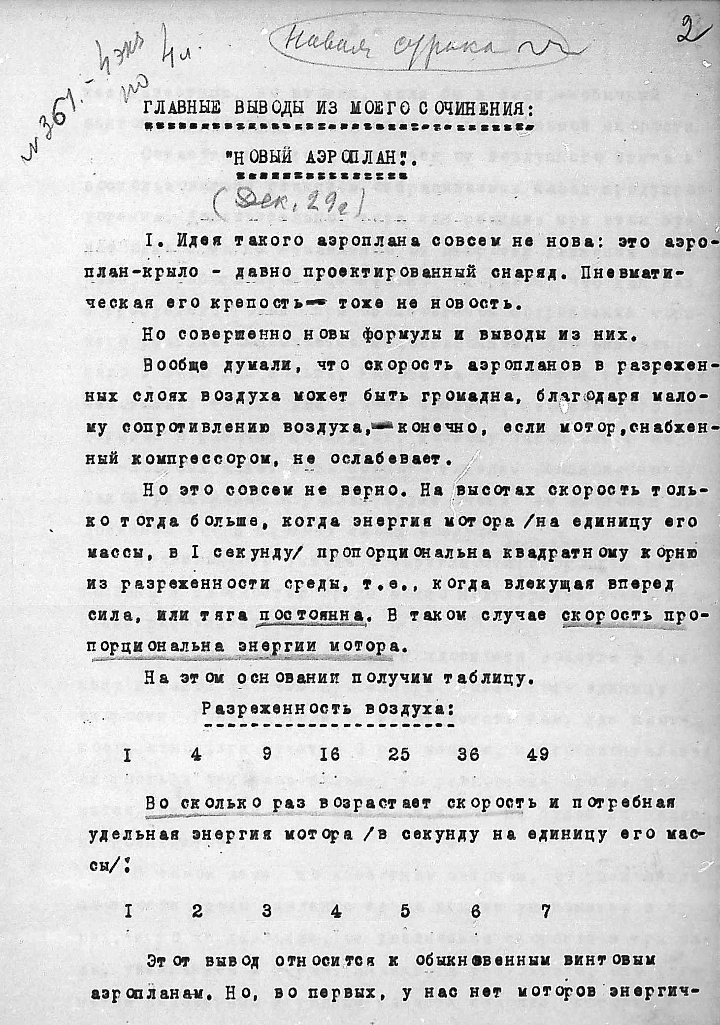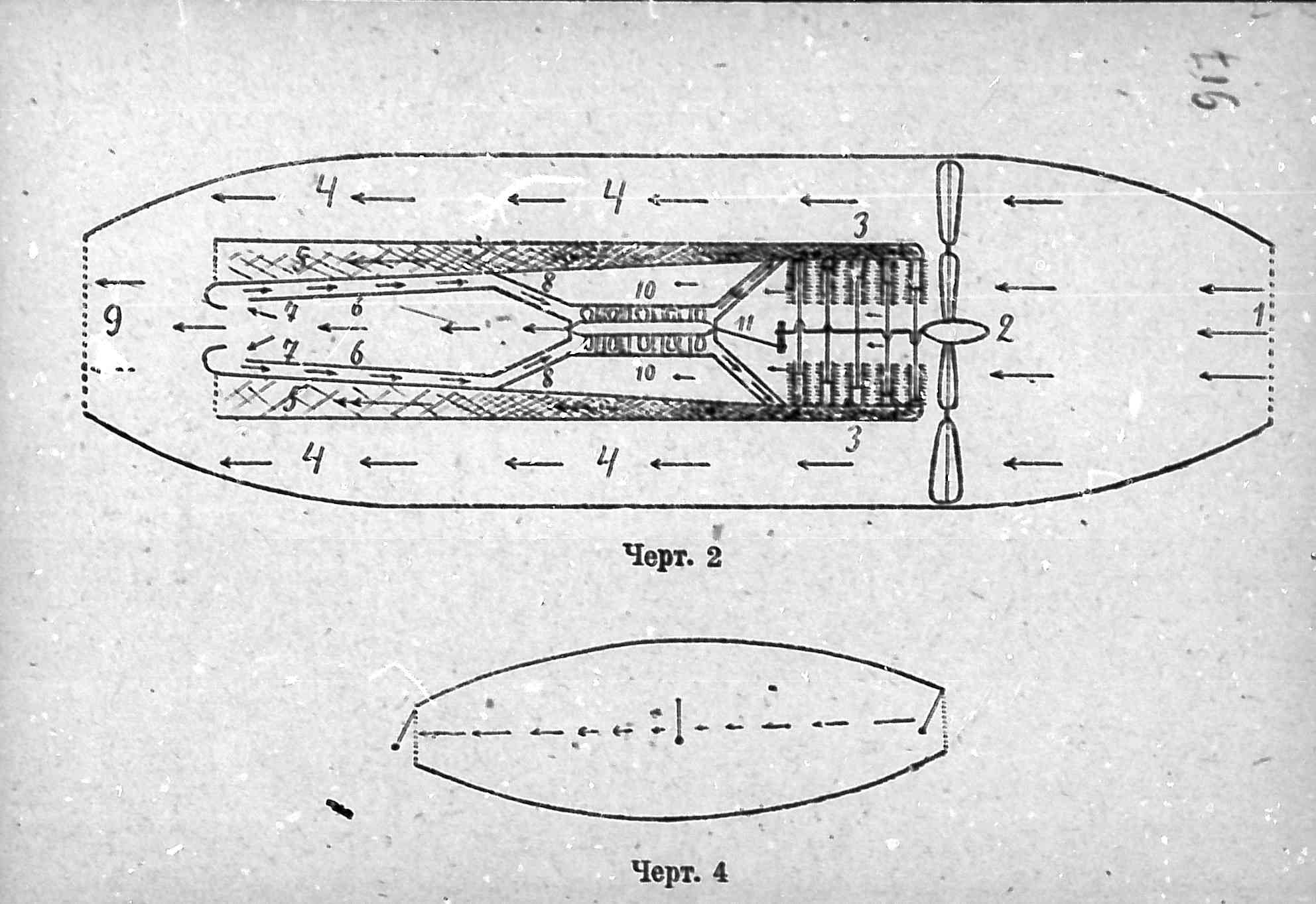 «Самолет движется силою воздушного винта и отдачей продуктов горения. Вся эта масса газов вылетает с большой скоростью через заднее изменяющееся отверстие среднего корпуса... Чем больше скорость самолета, тем более суживаются отверстия спереди и сзади среднего корпуса... Замкнутый пилотный и пассажирский корпус позволяет летать в самых разреженных слоях воздуха».