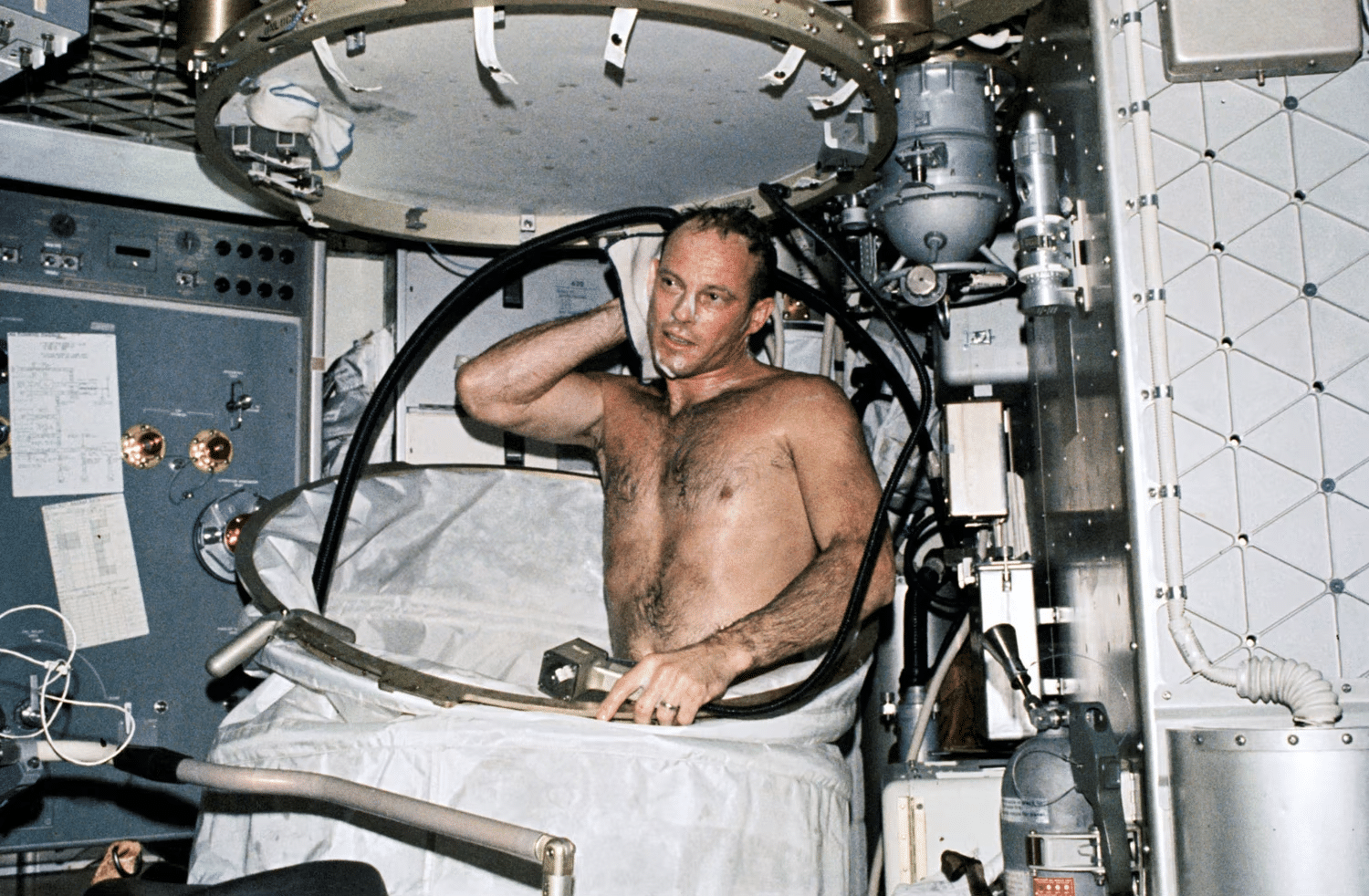 Астронавт Джек Р. Лусма, пилот экспедиции «Скайлэб 3», принимает горячий душ в каюте экипажа орбитальной лаборатории на околоземной орбите / ©NASA