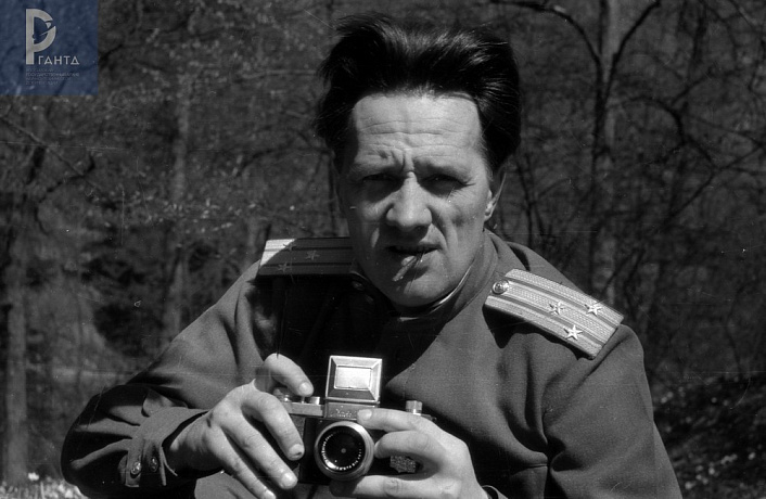 Н.А. Пилюгин с фотоаппаратом в руках во время командировки в Германию. 1946 г. Фото Б.Е. Чертока. РГАНТД. Ф. 36. Оп. 9. Д. 9.