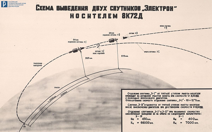 На рисунке № 4 приведена схема выведения двух спутников «Электрон» ракетой-носителем 8К72Д. «Электрон-1» размещался в цилиндрическом контейнере, расположенном перпендикулярно продольной оси ракеты, и был отстрелен с помощью порохового двигателя на активном участке работы 3-й ступени ракеты (на 610 секунде полета) на высоте 505 км при скорости 8,53 км/сек. «Электрон-2» отделился от 3-й ступени после выключения двигателя на 685 секунде при достижении скорости 10,02 км/сек. Рисунок № 5 показывает прохождение спутников «Электрон» через радиационные пояса Земли.