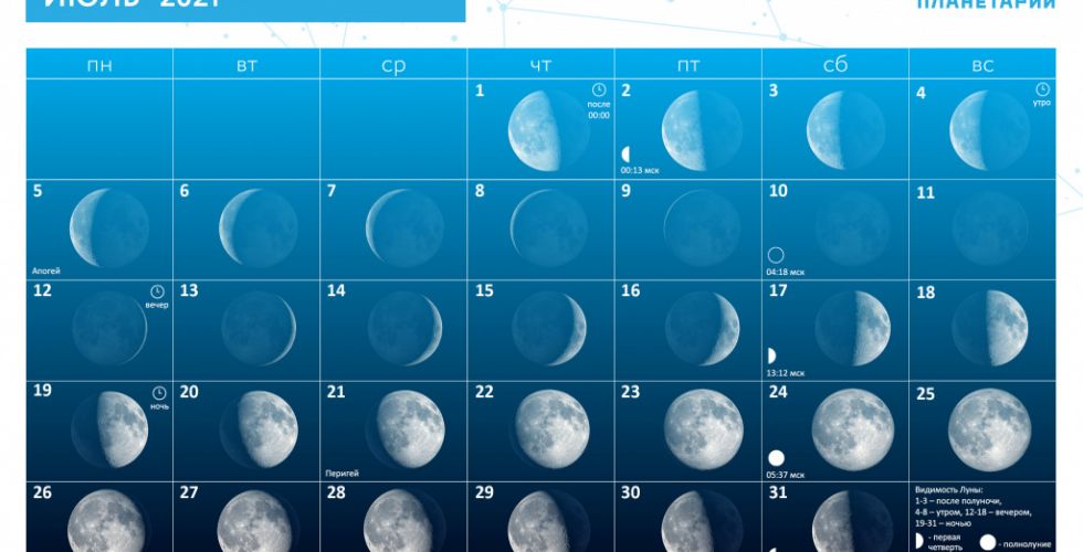 • 21 июля — Луна (Ф= 0,90+) в перигее — расстояние от Земли 364519 км, (видимый диаметр 32'47'') 13:31