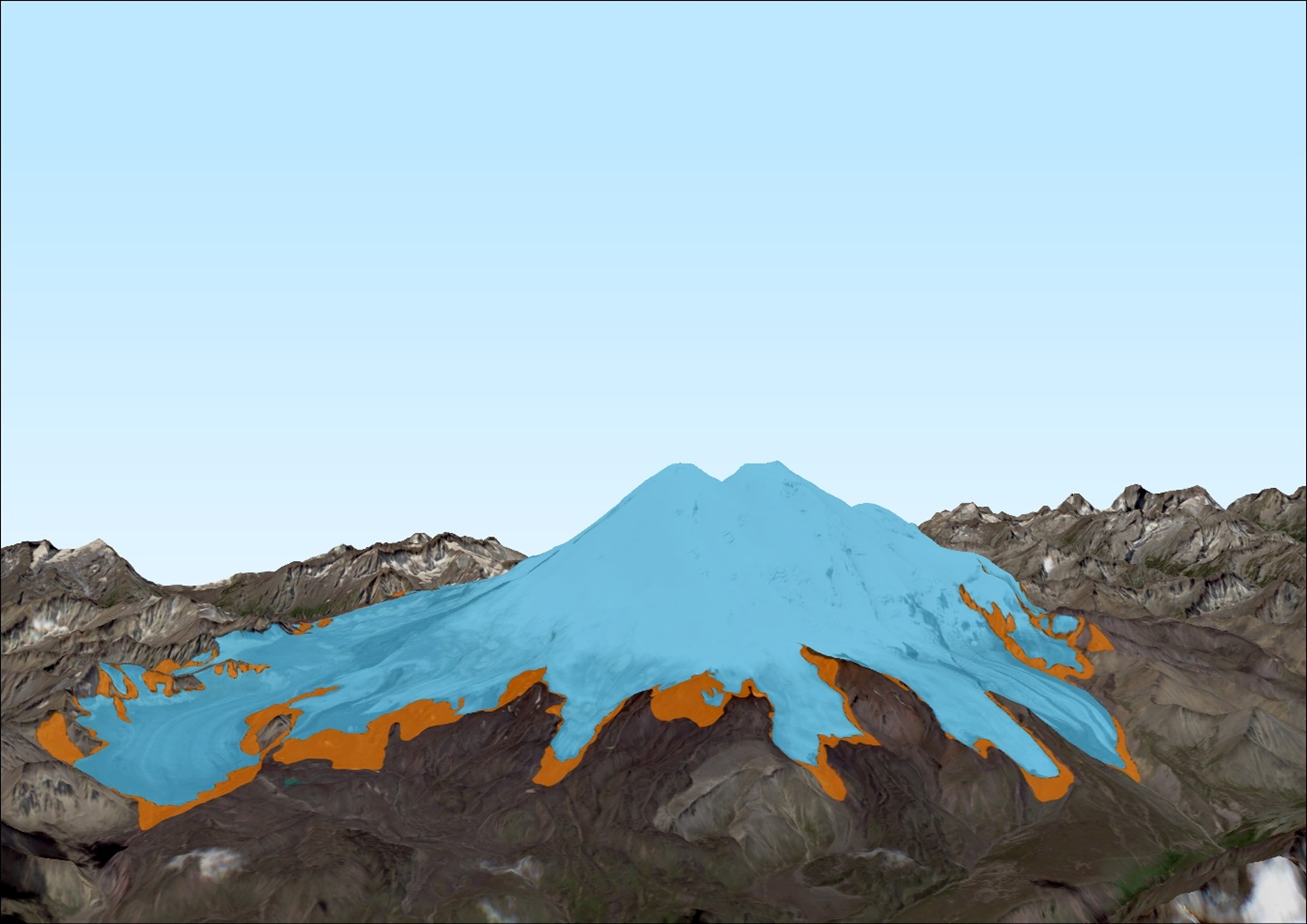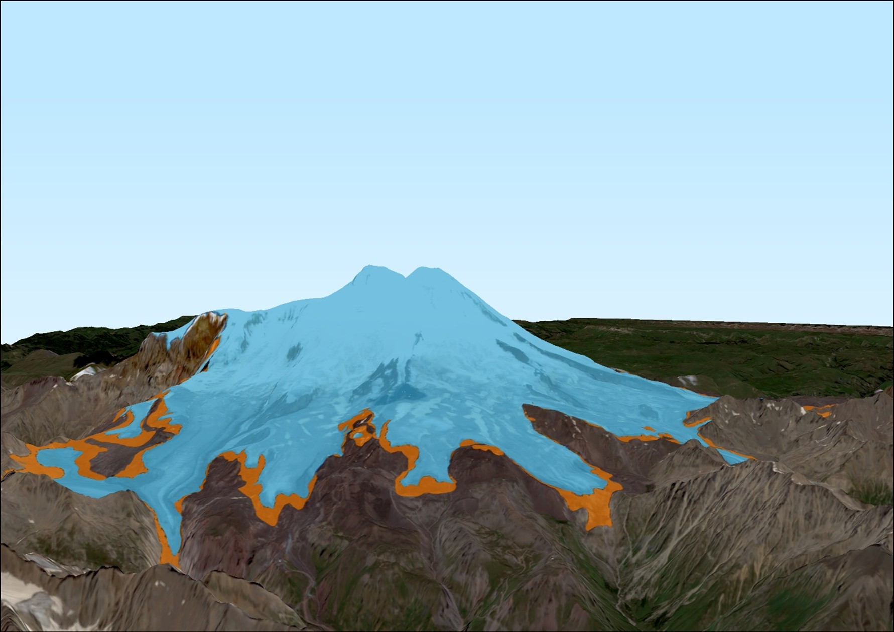 На космических снимках хорошо видно, как происходит отступание ледового массива Эльбруса: языки отдельных ледников «поднимаются» вверх по долине, оставляя после себя ледниковые озера, моренные гряды и окатанные валуны.