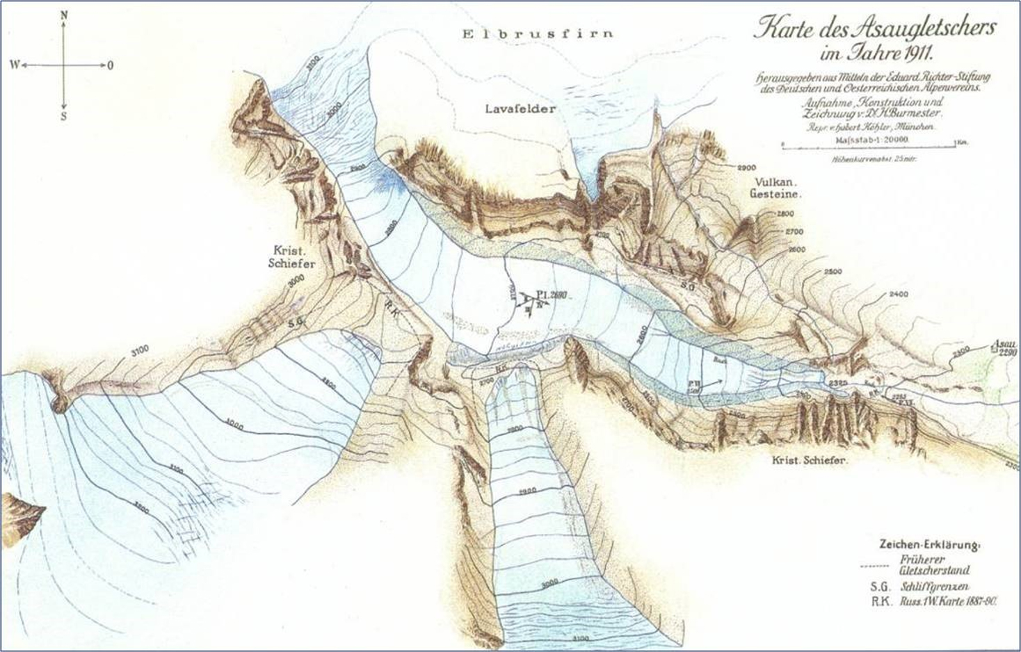 Карта языка ледников Большой и Малый Азау (составлена Г. Бурмейстером в 1911 г.)