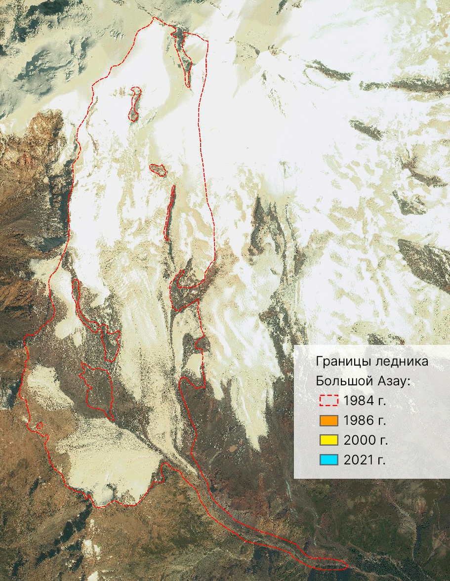 Отступает самый крупный и наиболее изученный ледник Эльбрусского массива – Большой Азау. Его исследования начались в середине XIX века. Примерно до 1885 г. ледники Большой и Малый Азау были одним целым с единой областью аккумуляции, многочисленными внутриледниковыми потоками и общим языком. Началась деградация льда, и Малый Азау сформировался в отдельный ледник. После 1887 г. Большой и Малый Азау уже не срастались.