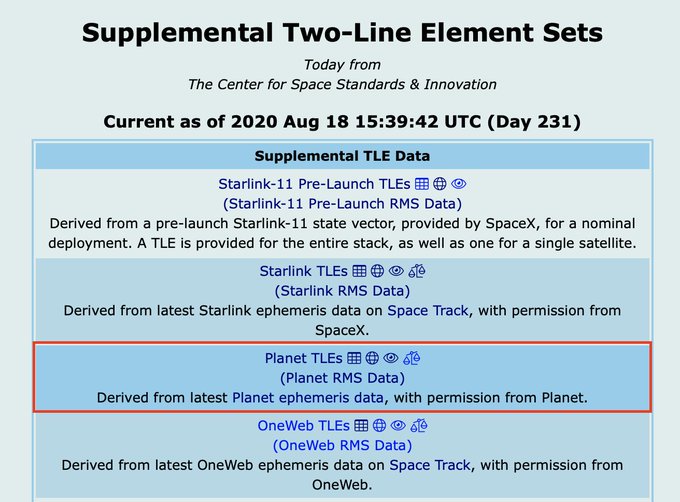 CelesTrak now has SupTLEs for the 3 SkySat satellites (C17, C18, & C19) just launched Aug 18 at 1431 UTC, thanks to @planetlabs making their ephemerides available to the public: https://celestrak.com/NORAD/elements/supplemental/....