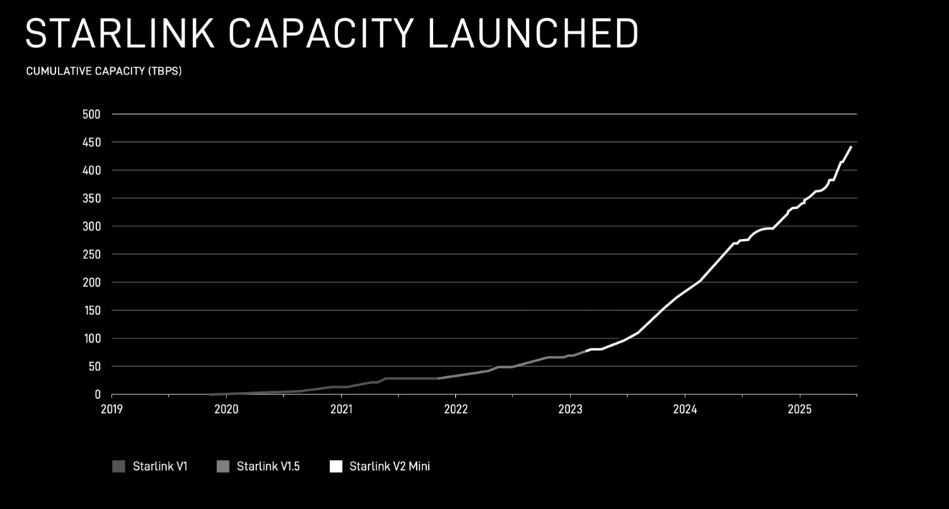 Ёмкость Starlink Gen1 Phase 1, спутники для которой полтора года запускали, составляла 35 Tbps. Сейчас от тех спутников на рабочих орбитах осталось 45%, а в нынешней сети на 450 Tbps на их долю приходится 4.2% емкости.