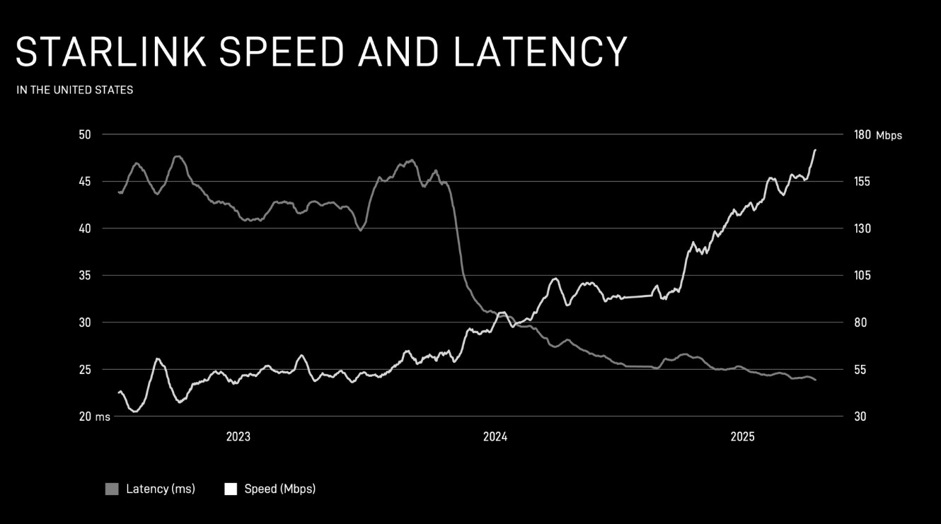 В США средняя скорость загрузки в часы пиковой нагрузки достигает 200 Мбит/с, задержка – 25,7 мс. Менее 1% замеров превышают 55 мс. Starlink также имеет крупнейшую в мире наземную инфраструктуру спутниковой связи — только в США развернуто более 1500 антенн более чем на 100 объектах.