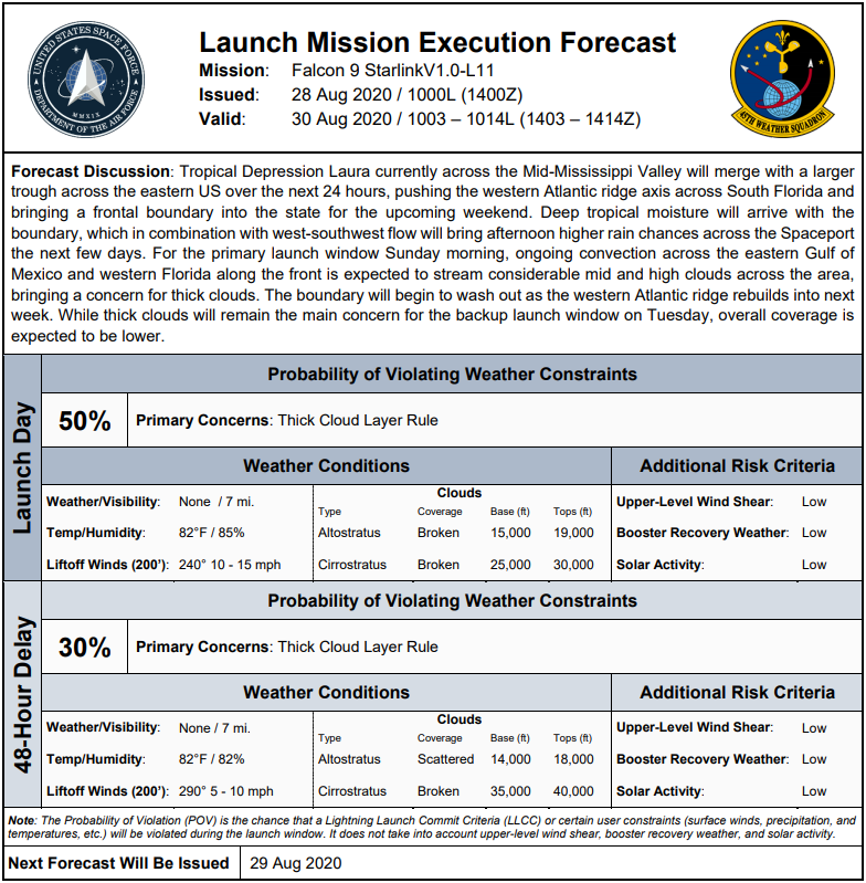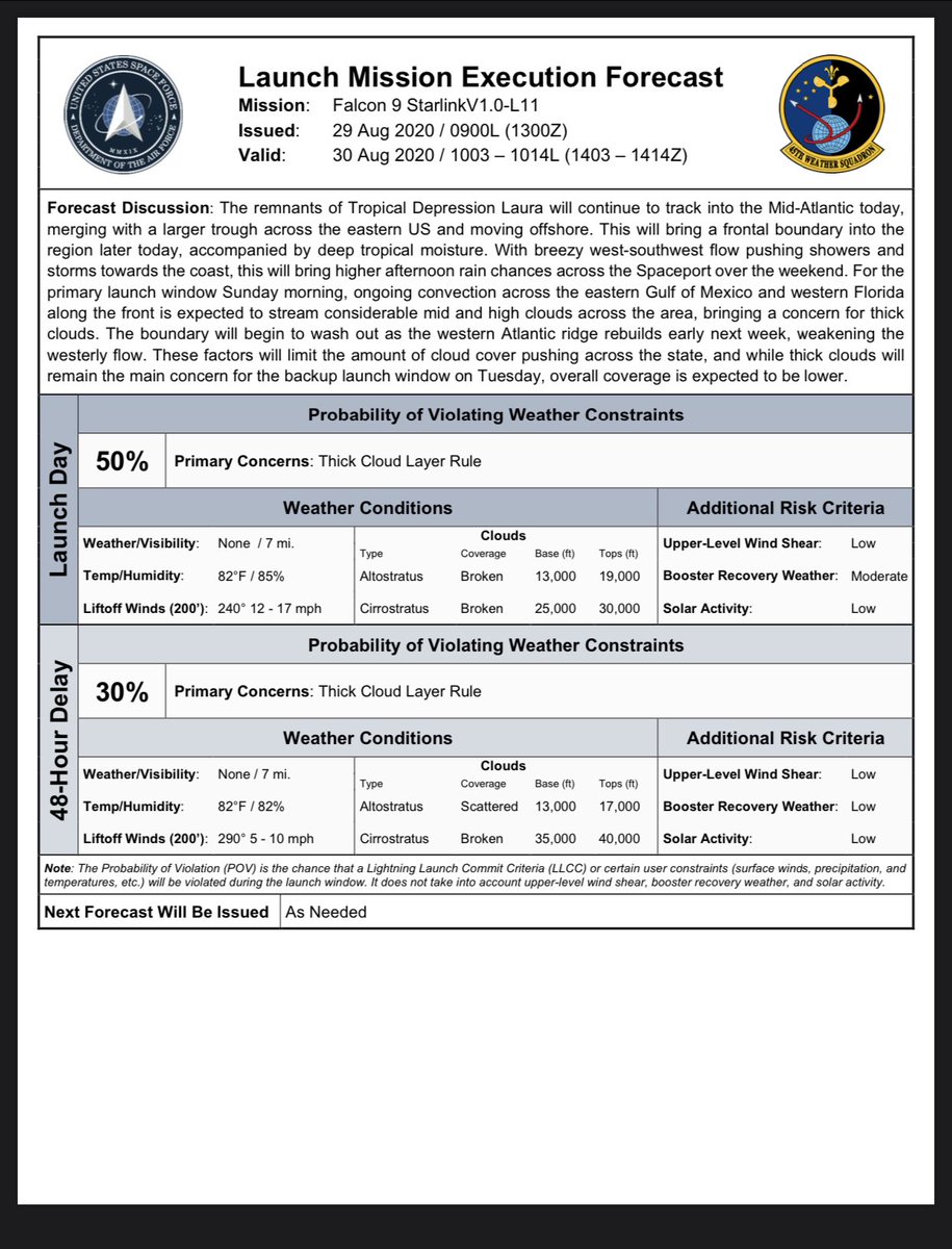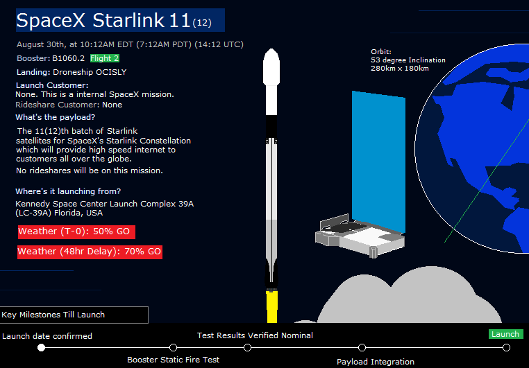 #SpaceX teams are targeting August 30th, at 10:12AM EDT (7:12AM PDT) (14:12 UTC) for the launch of the 11(12)th #Starlink mission from LC-39A. This mission will deploy a full batch of 60 Starlink satellites with no rideshares onboard. Weather stands at 50% GO. #Falcon9