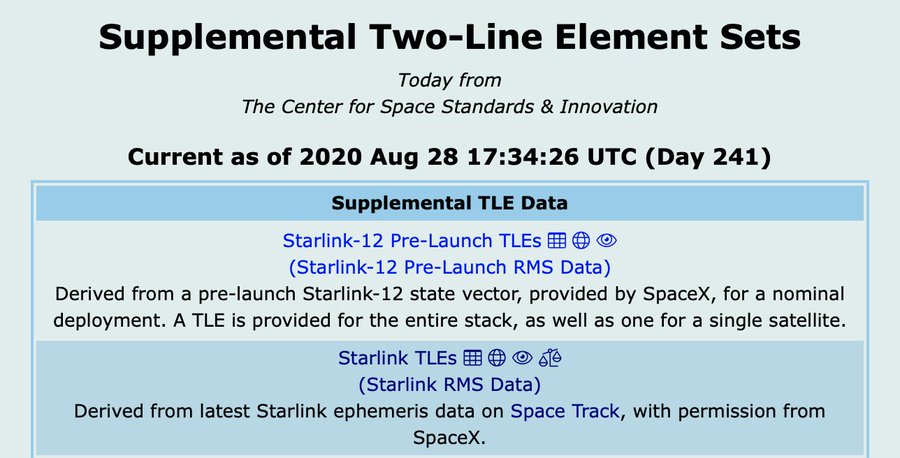 CelesTrak has pre-launch SupTLEs for the #Starlink launch scheduled for Aug 30 at 1412 UTC. Deployment of 60 satellites is set for 2020-08-30 14:27:22.390 UTC. We expect this to be Launch 2020-061 but will update data if that changes (2 other launches set prior this weekend).