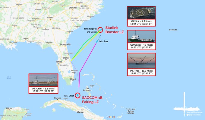 Fleet Update: After being at dead stop in the #SAOCOM1B fairing catch zone it appears the sisters did an about face to head north. It is possible we could see a shuffle of the SpaceX launch cadence this weekend. Are they heading to the #Starlink LZ instead? #SpaceXFleet