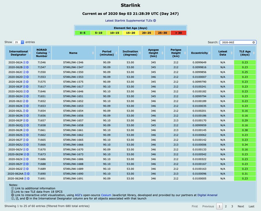 CelesTrak now has SupTLEs for all 60 #Starlink satellites (2020-062) launched on a Falcon 9 from Cape Canaveral on Sep 3 at 1246 UTC: https://spaceflightnow.com/2020/09/03/spacex-launches-more-starlink-satellites-beta-testing-well-underway/.... Data can be found at: https://celestrak.com/NORAD/elements/supplemental/....