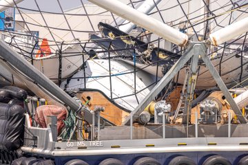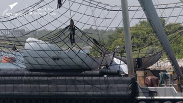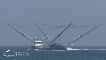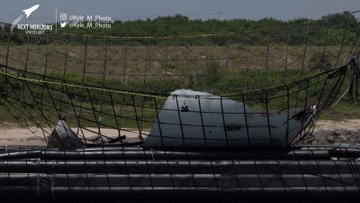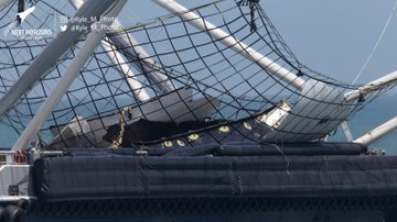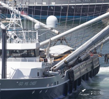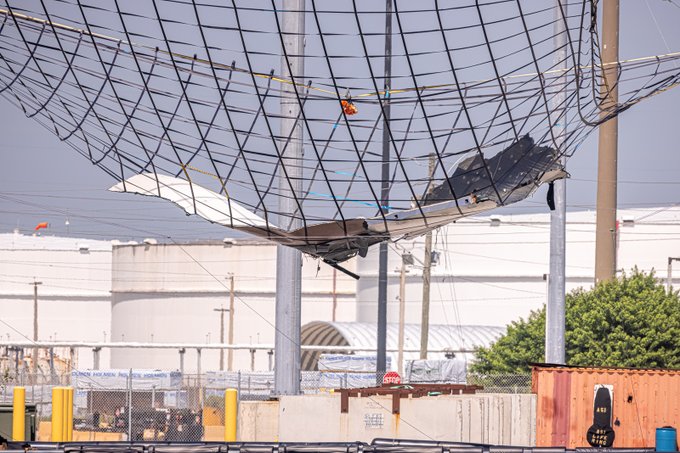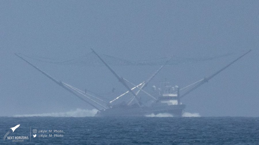 One of the fairing catchers can just barely be seen on the horizon now.  It looks like the fairing is still being held in the scoop net, this usually means it is damaged. #SpaceXFleet #SpaceX