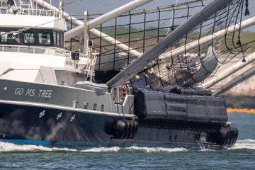 GO Ms. Chief's scoop net revealing the broken fairing half from the 12th Starlink mission was raised briefly but has been laid back down on the deck