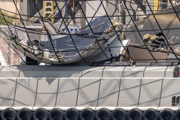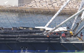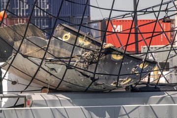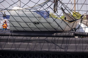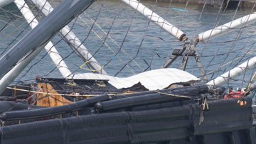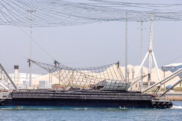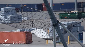 I can't tell for sure because I'm at a bad angle, but I think they're using tree's scoop net to put the fairing remains on the dock.
