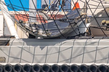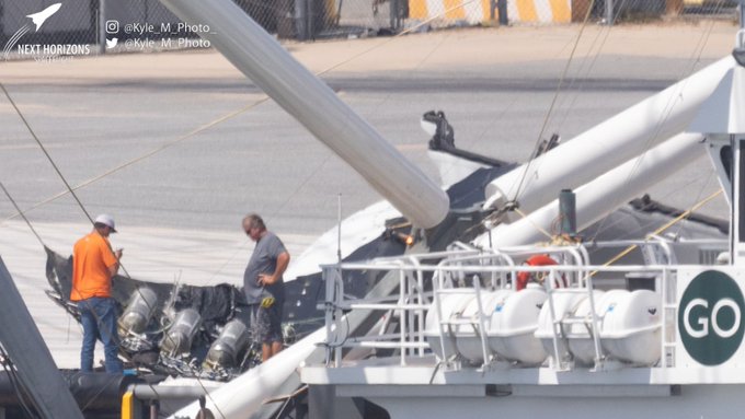 A few more close ups of GO Ms. Tree's fairing half from the 12th Starlink mission. Looks like Ms. Chief recovered much flatter pieces or they are below the deck line. Not much to see on its deck from here. #SpaceXFleet