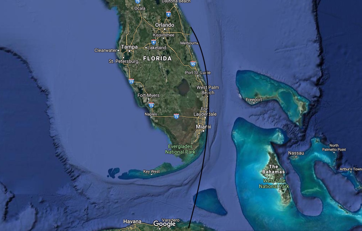 Although the Falcon 9 rocket will follow a source that brushes the South Florida coast, population centers in that region will not be at risk from the launch because its "instantaneous impact point" — where debris would fall if the rocket failed — remains offshore due to the vehicle's bending trajectory.