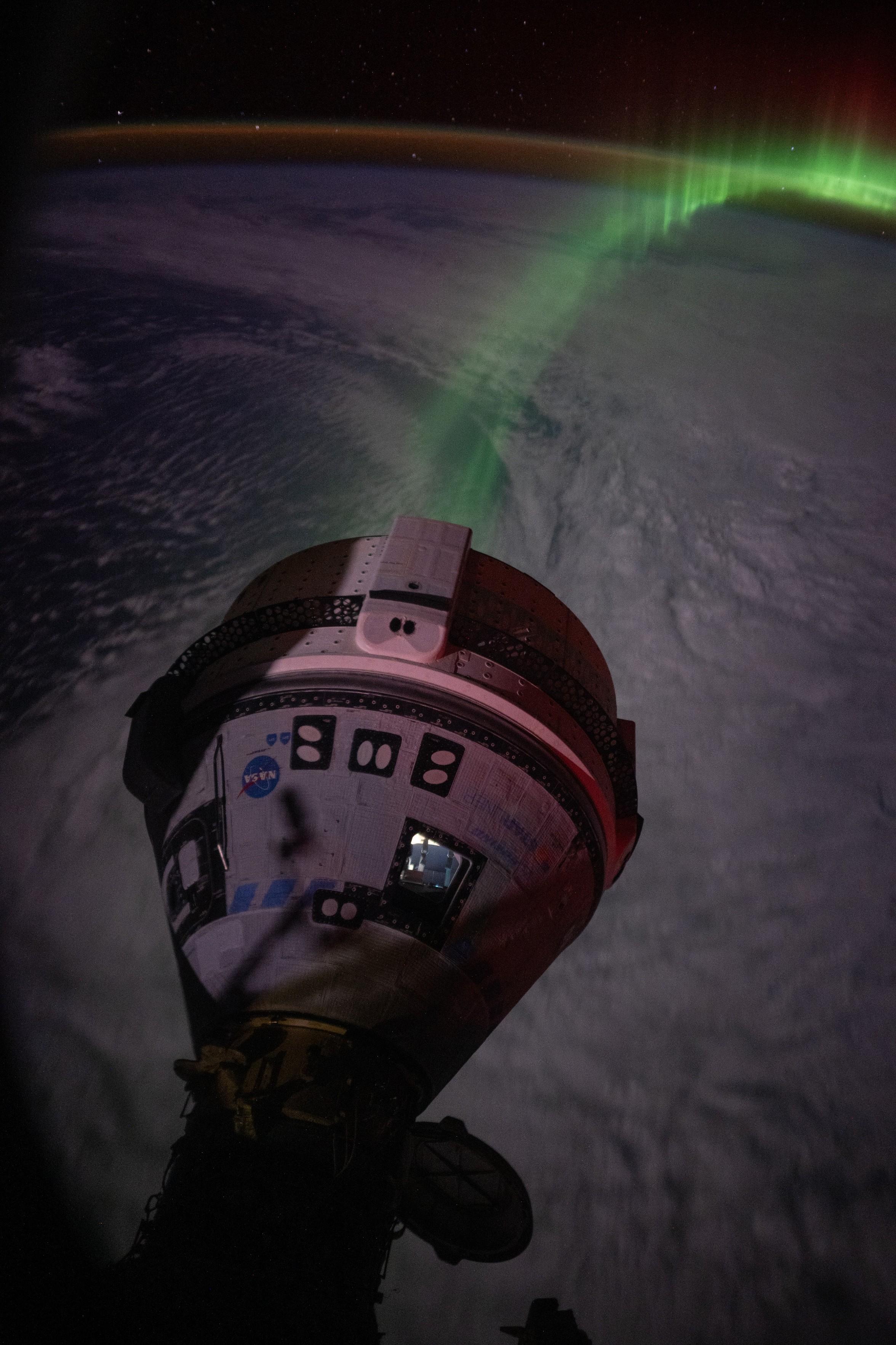 Мэтью Доминик поделился этим снимком на сайте, посвященном птицам. На нем изображен Boeing Starliner с авророй, видимой на Земле, снятой с борта МКС.