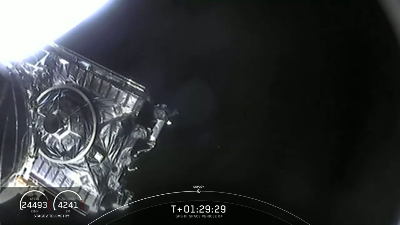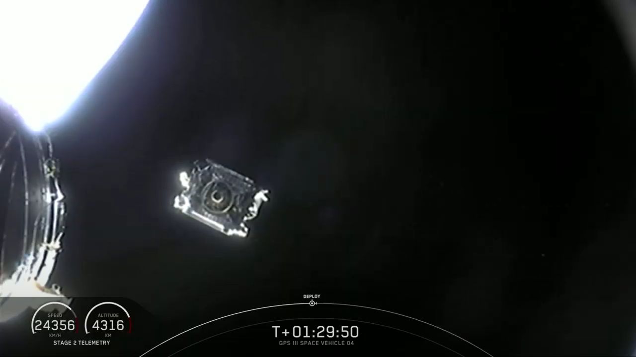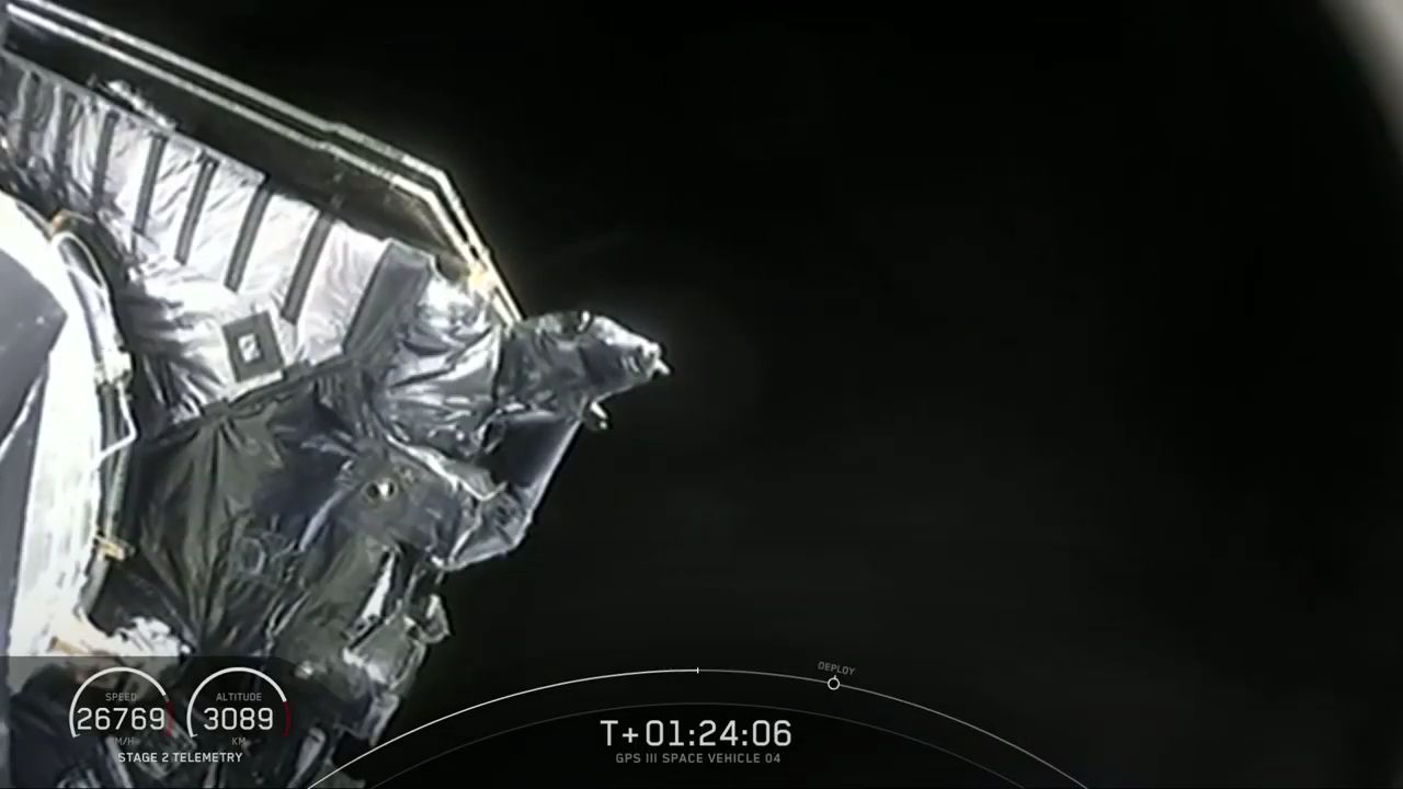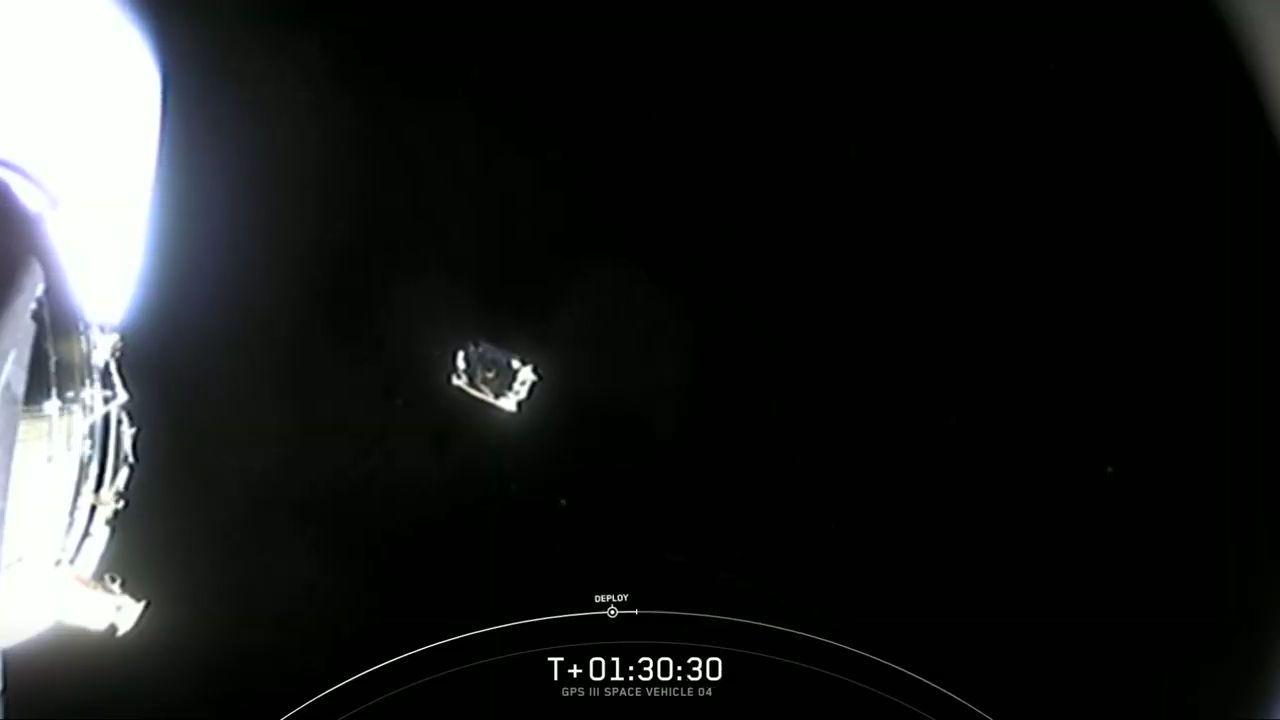 Flying 2,600 miles (4,200 kilometers) over the Pacific Ocean, SpaceX's Falcon 9 rocket has deployed the US military's GPS 3 SV04 navigation satellite into an on-target orbit.