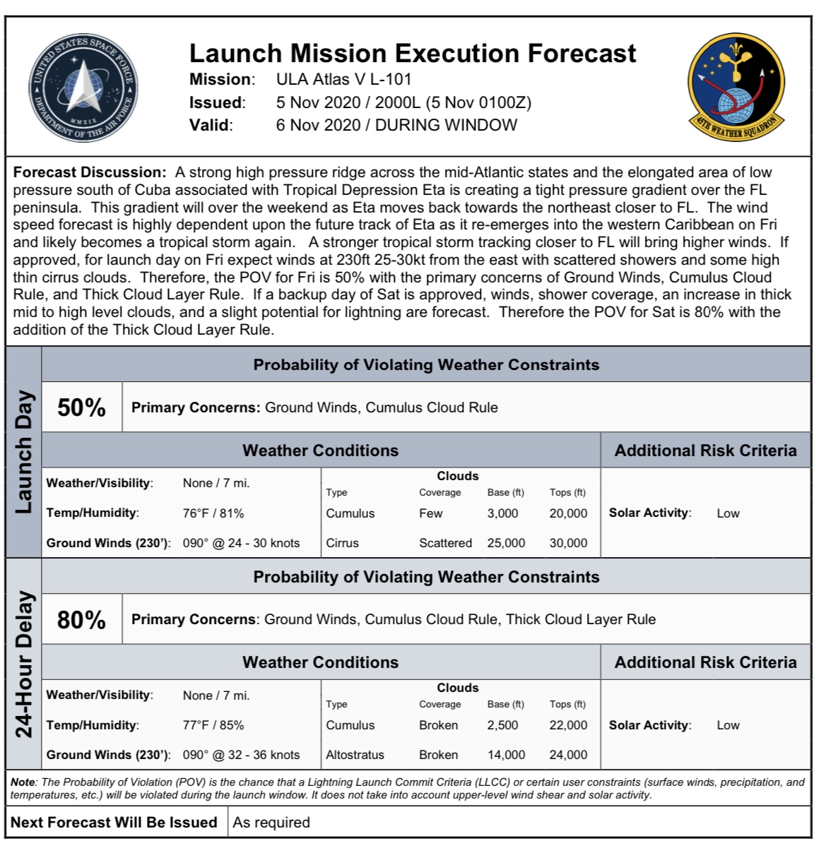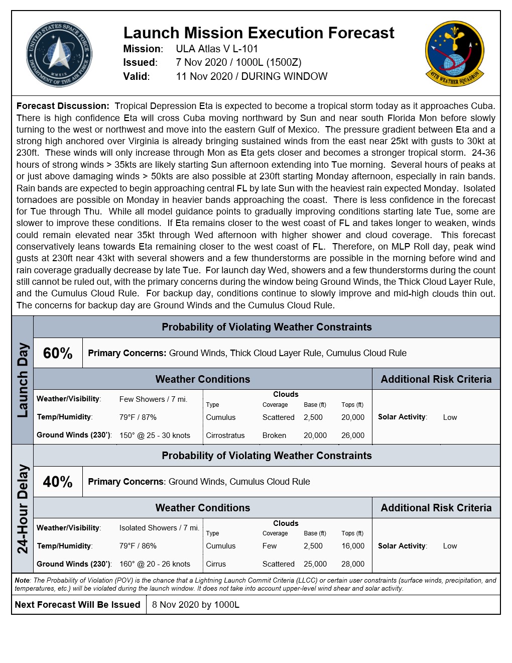 Atlas V L-101 L-1 Day Forecast for 6 Nov Launch